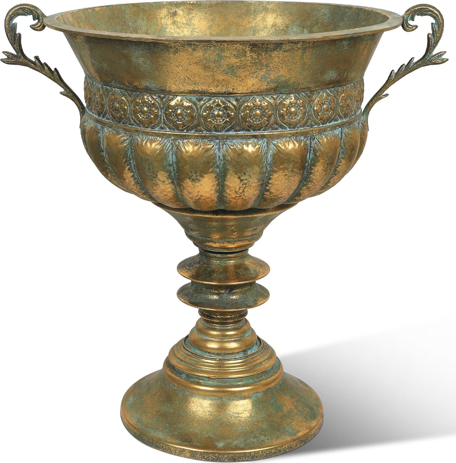 WORTH 26.5″ H. Large Metal Urn Planter – Antique Gold Classic Iron Plant Pot – Traditional Tall Decorative Luxury Flower Pot for Patio, Front Porch, Indoor Outdoor Use – 26.5″L x 21″W x 26.5″H, 9lbs