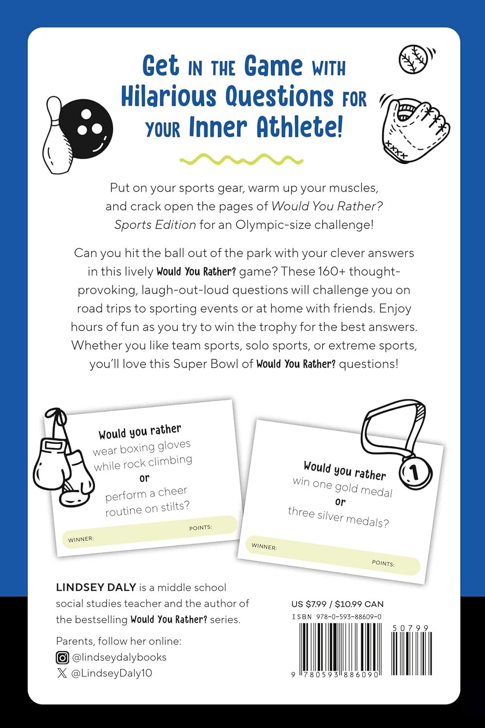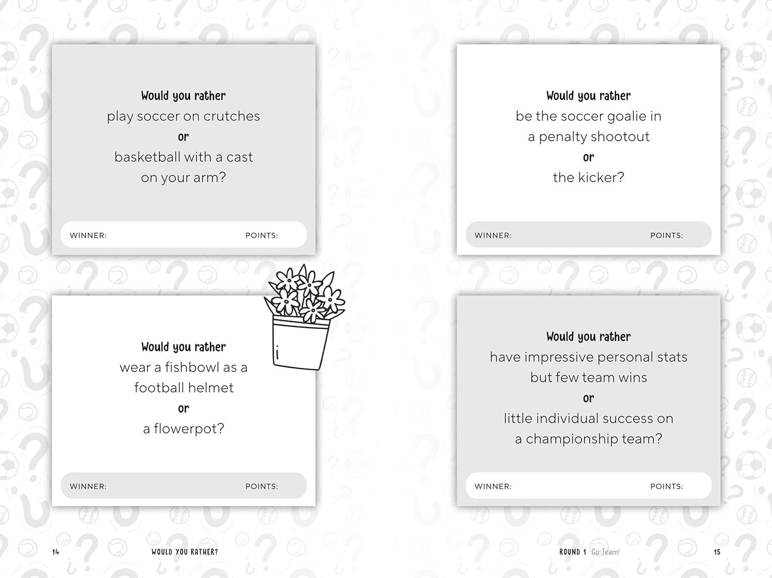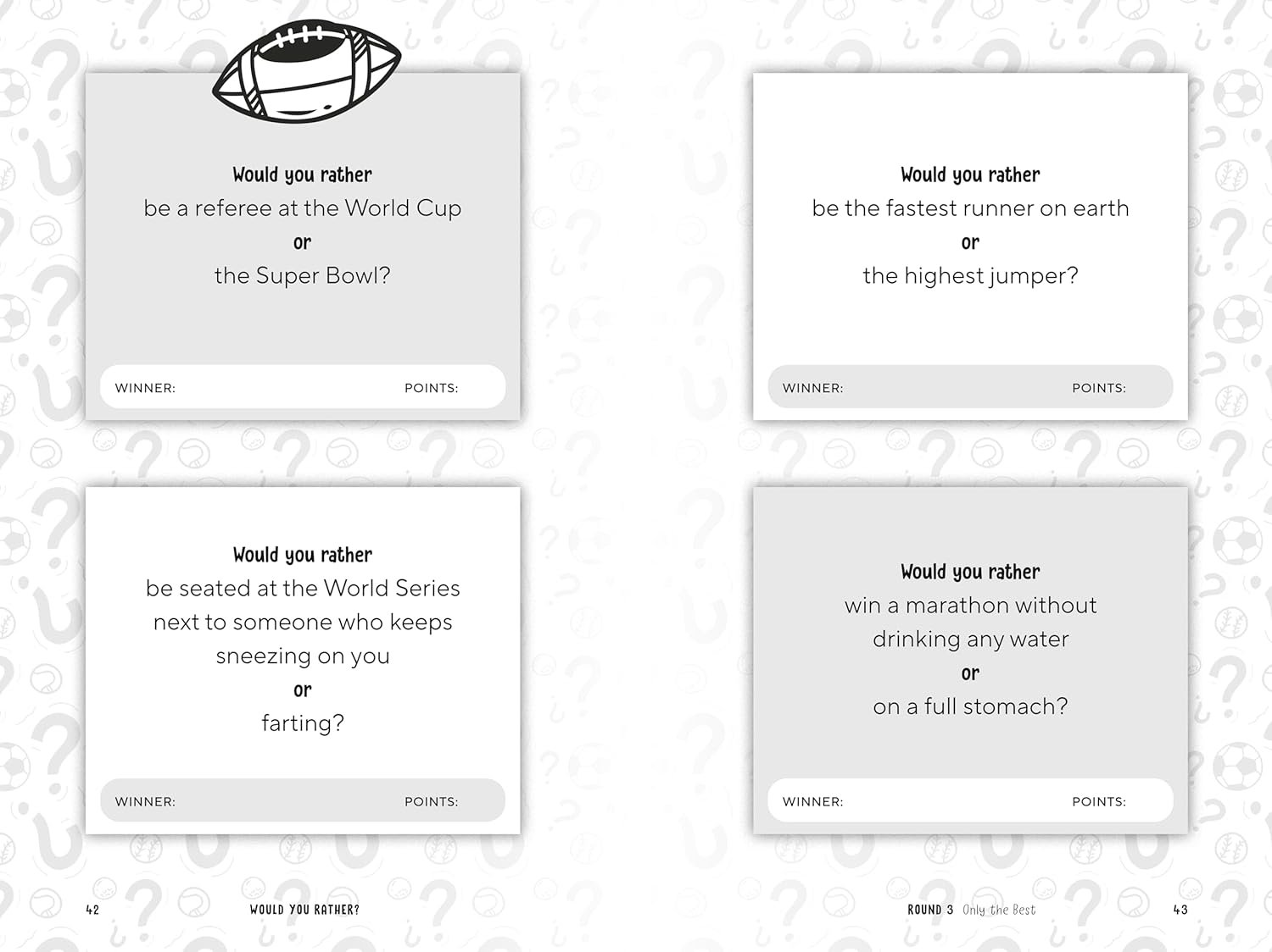 160+ Would You Rather? questions about football, baseball, basketball, soccer, hockey, gymnastics, rock climbing, volleyball, skateboarding—even curling!—and so much more.Thought-provoking scenarios that entertain and challenge kids ages 8–12 to think creatively and speak persuasively.An awesome game for kids and families: Who’s the funniest, most creative, or smartest?A great way to pass time traveling to sporting events, at restaurants, or at a doctor’s office—without screens.Makes the perfect gift for birthdays and holidays for the children in your life.