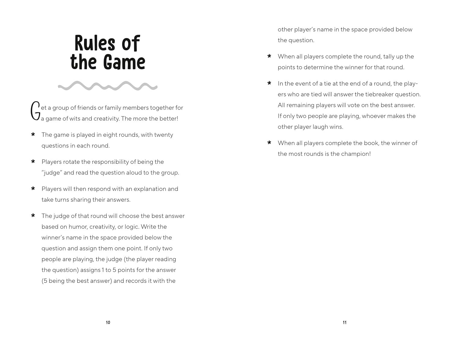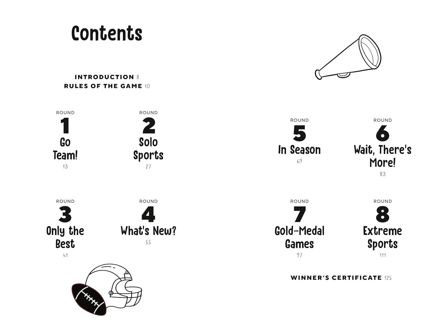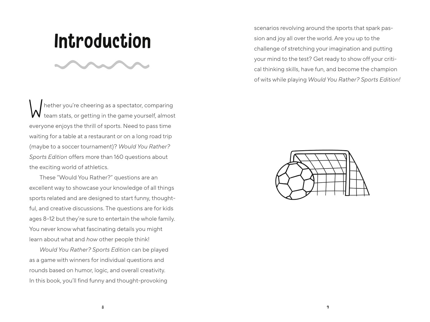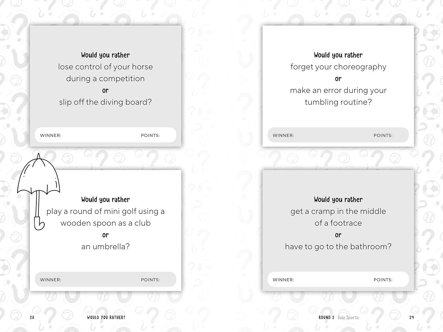 160+ Would You Rather? questions about football, baseball, basketball, soccer, hockey, gymnastics, rock climbing, volleyball, skateboarding—even curling!—and so much more.Thought-provoking scenarios that entertain and challenge kids ages 8–12 to think creatively and speak persuasively.An awesome game for kids and families: Who’s the funniest, most creative, or smartest?A great way to pass time traveling to sporting events, at restaurants, or at a doctor’s office—without screens.Makes the perfect gift for birthdays and holidays for the children in your life.
