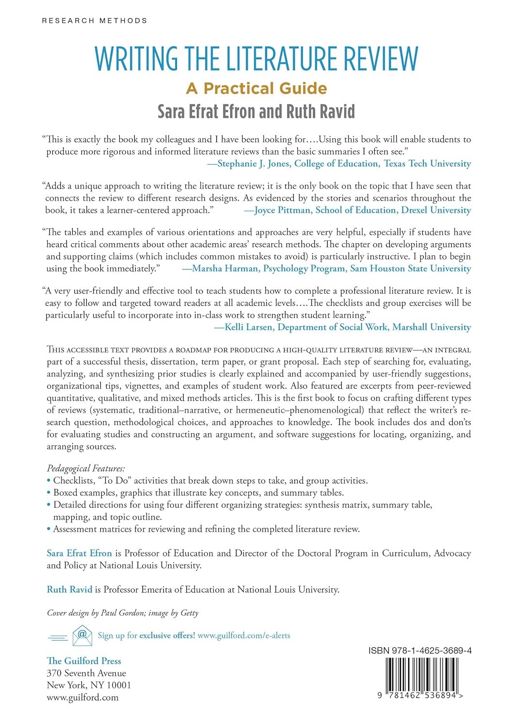 This accessible text provides a roadmap for producing a high-quality literature review–an integral part of a successful thesis, dissertation, term paper, or grant proposal. Each step of searching for, evaluating, analyzing, and synthesizing prior studies is clearly explained and accompanied by user-friendly suggestions, organizational tips, vignettes, and examples of student work. Also featured are excerpts from peer-reviewed quantitative, qualitative, and mixed methods articles. This is the first book to focus on crafting different types of reviews (systematic, traditional–narrative, or hermeneutic–phenomenological) that reflect the writer’s research question, methodological choices, and approaches to knowledge. It describes what all reviews have in common and highlights distinct characteristics of each type. The book includes dos and don’ts for evaluating studies and constructing an argument, and software suggestions for locating, organizing, and arranging sources.
