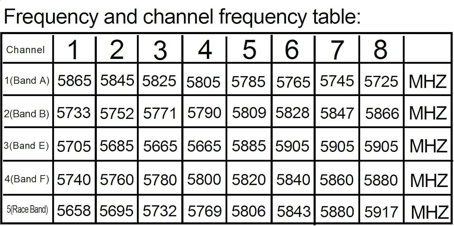 Frequency:5.8GHz 5 bands 37 channels, with Raceband: 5658-5917MHz