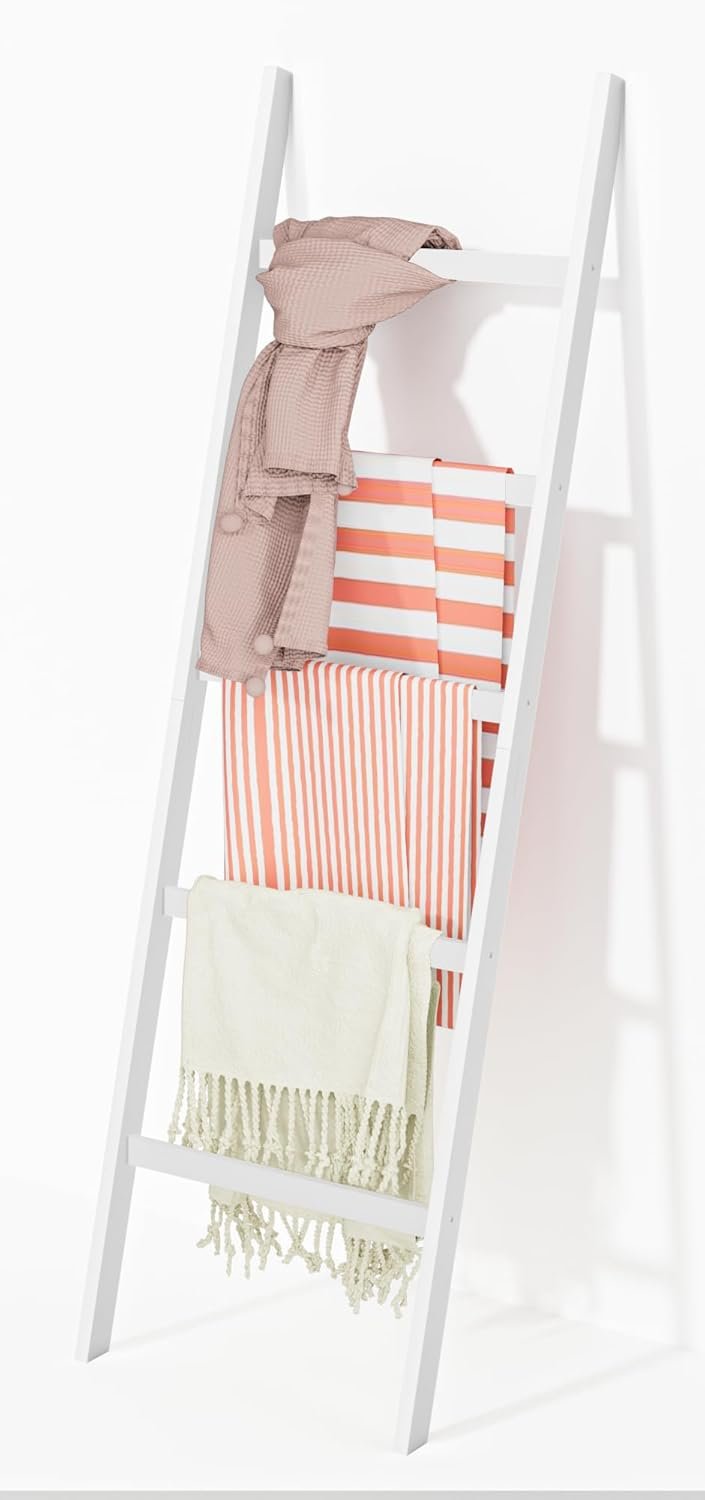 WTZ Bamboo Blanket Ladder, 5-Layer Towel Racks, Blanket Holder with Anti-Slip Construction Home Decor, Decorative Blanket, Quilt, Towel, Scarf Ladder Shelves for Livingroom, Bedroom, Bathroom, White