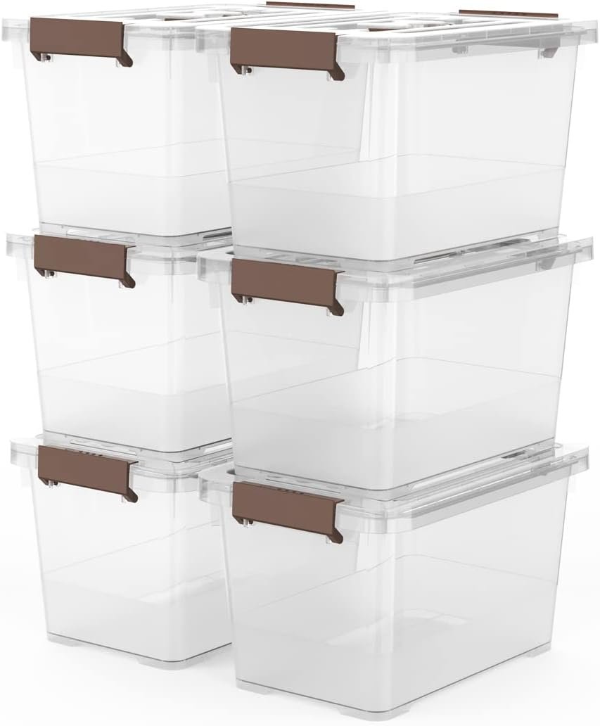 WYT 6-Pack Clear 7 Quart Storage Latch Box/Bins, Plastic Stackable Latching Box with Brown Handle and Lid, Multi-Purpose, 7 Litre