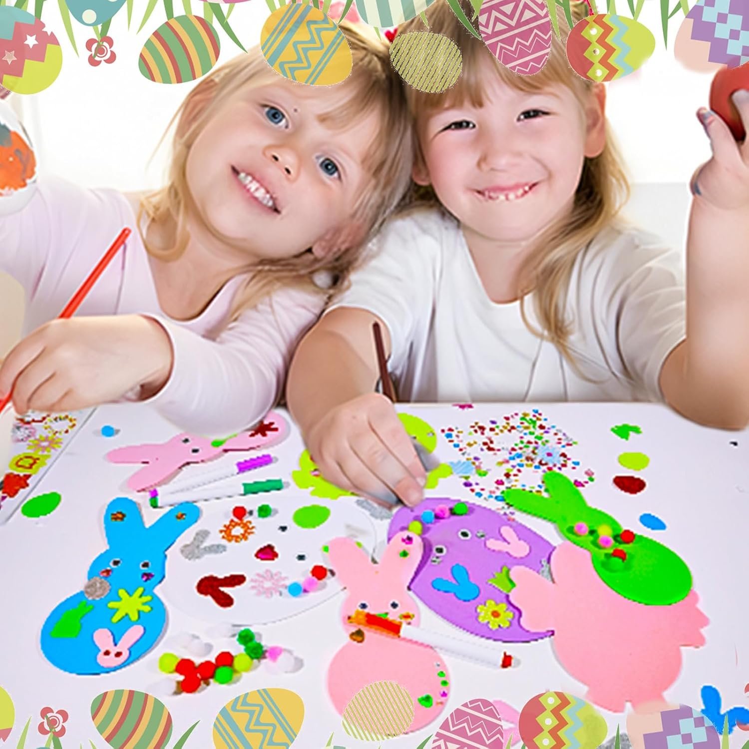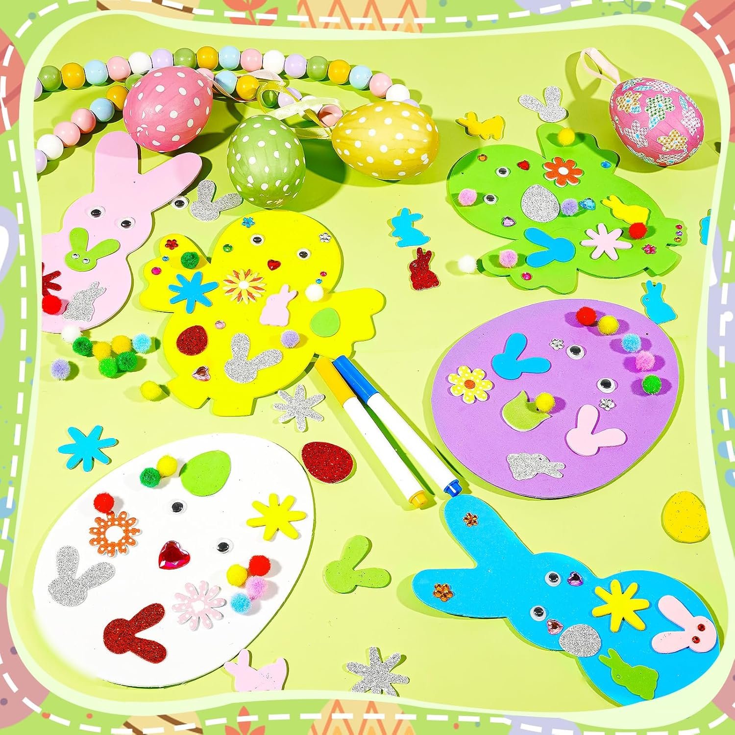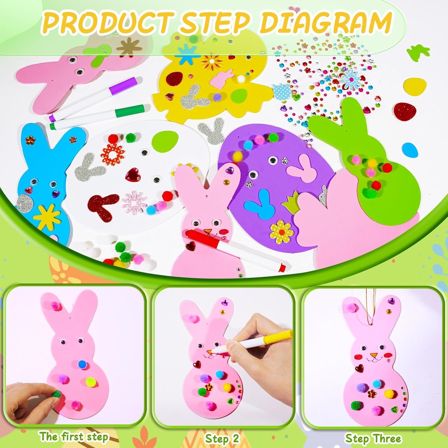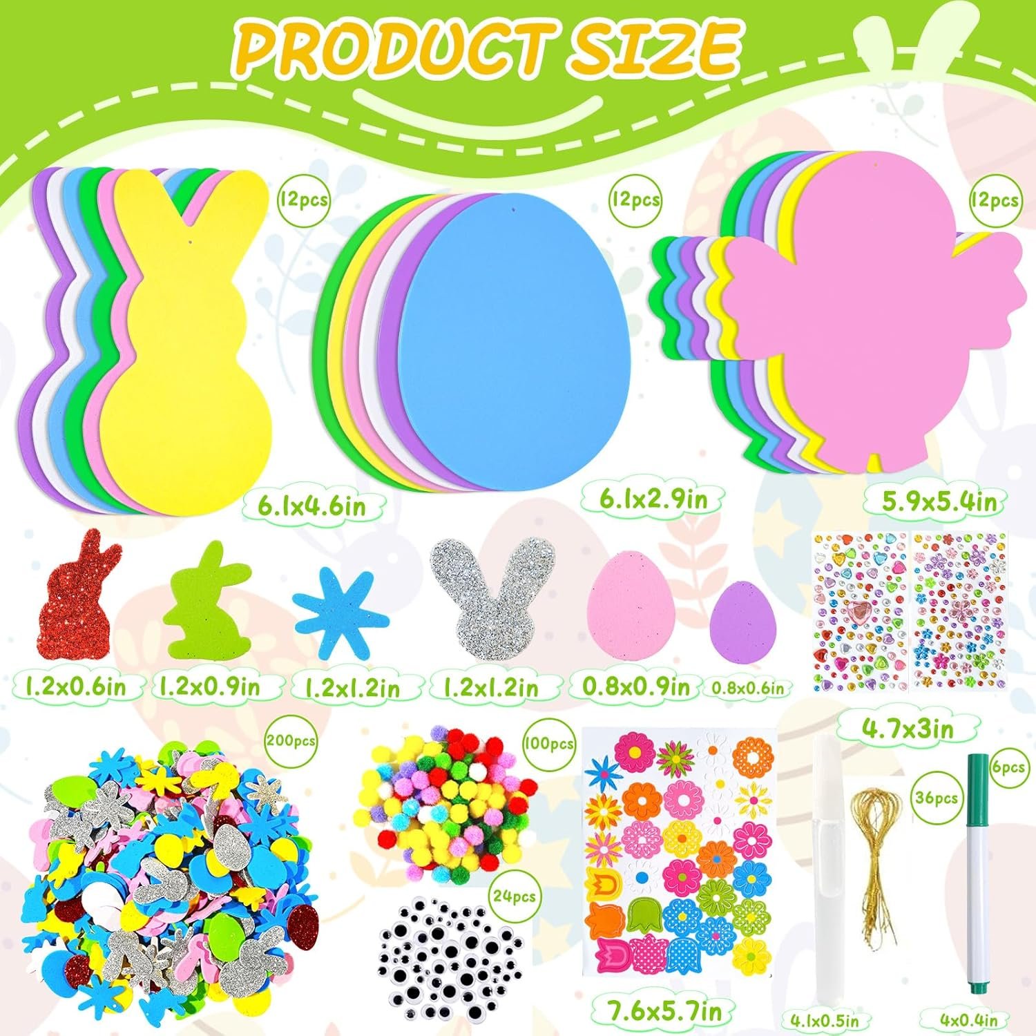 Package Contains: 12 pcs x foam Easter eggs 12 pcs x foam bunny 12 pcs x foam chicks 200 pcs x foam Easter stickers 36 pcs x gold cords 24 pcs x wiggle googly eyes 6 pcs x color pens 2 pcs x colored diamond stickers 100 pcs x pompoms 1 pcs x flower sponge patch 1 pcs x glue Feature: Easter Foam Stickers Set great for party supplies, Easter cards, bulletin boards, hanging decor and diy making, bringing happiness to your family and friends