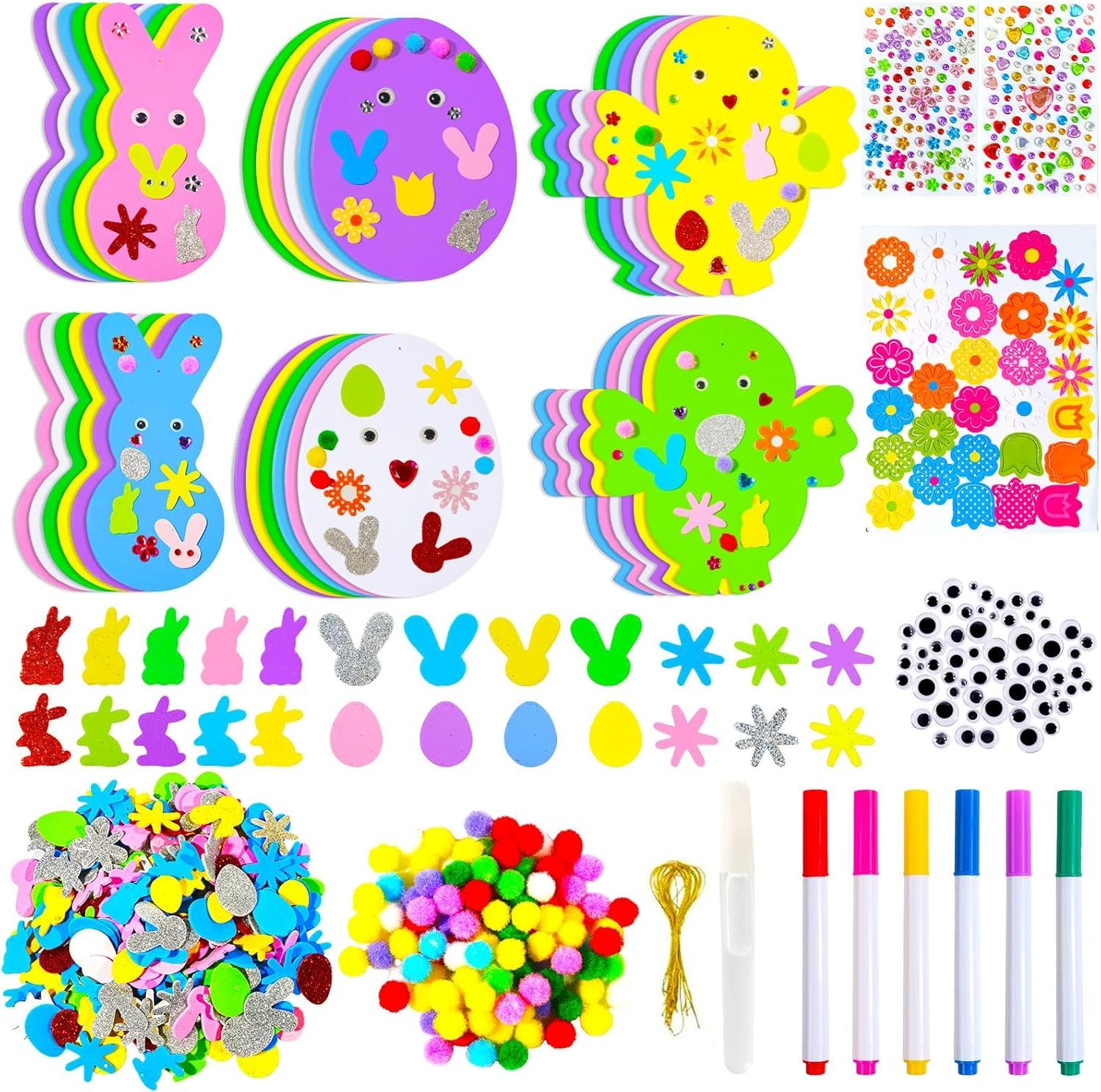 Easter Foam Stickers Set: 12Pcs foam Easter eggs, 12pcs foam bunny, 12pcs foam chicks, 200pcs foam Easter stickers,36pcs gold cords, 24 wiggle googly eyes, 6 color pens, 2 pcs colored diamond stickers, 100 pcs pompoms, 1 pcs flower sponge patch and 1 pcs glue
