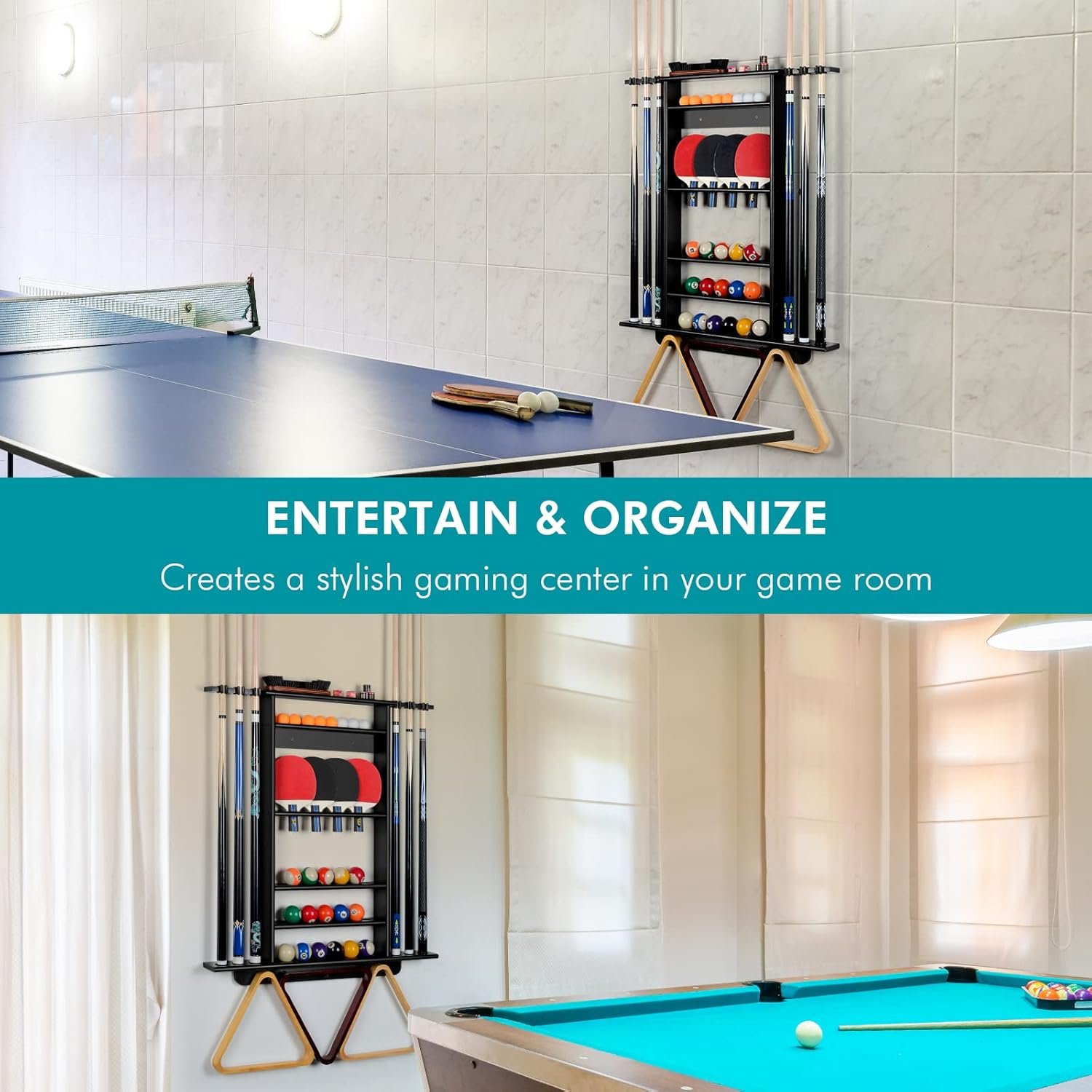 🎱【SAVING SPACE】Using a wall-mounted pool cue rack to hold your cues is a great way to store all your pool table accessories without taking up valuable floor space when billiard room space is limited, this gorgeous 2-in-1 pool and table tennis combo wall mount rack saves space and keeps your game room neat and tidy.