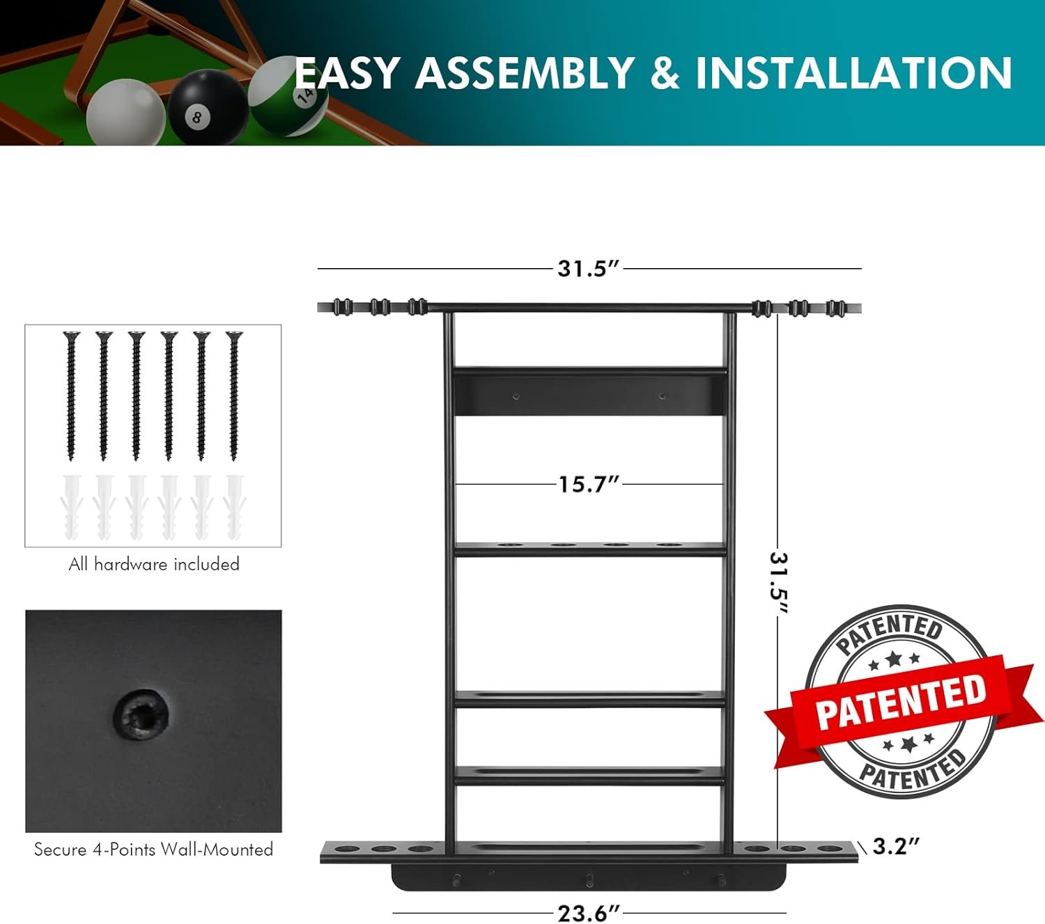 🎱【CUE RACK ONLY】The pool stick rack is easy to set up and install. All the assembly, mounting hardware and detailed picture instruction are provided along. Note: Cues, paddle, balls, ball rack, chalk, brush and bridge head are not included.