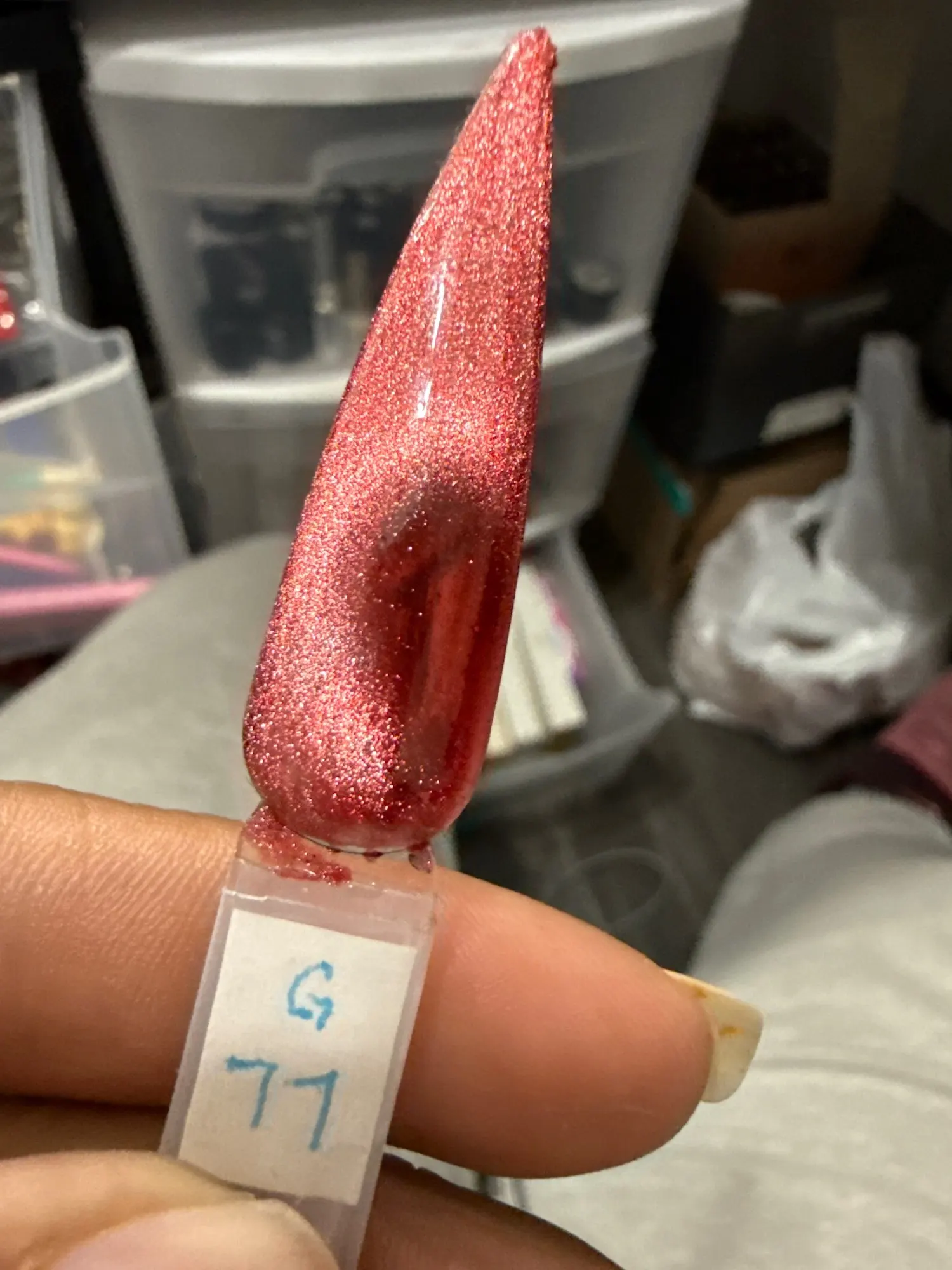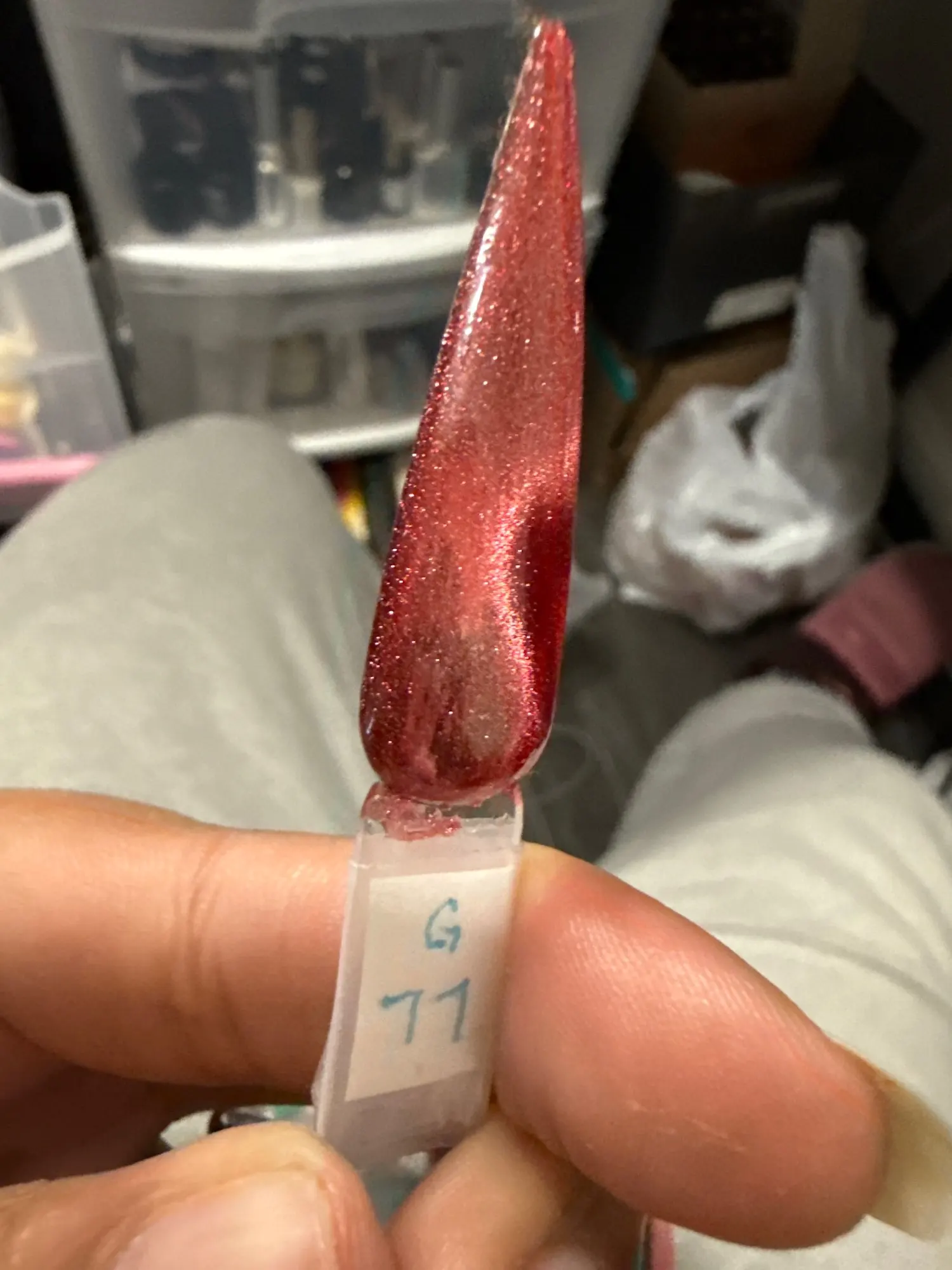 So pretty really bright cat eye/there are large magnetic particles and small ones and it creates a really dynamic flash! Love the deep red jelly base!