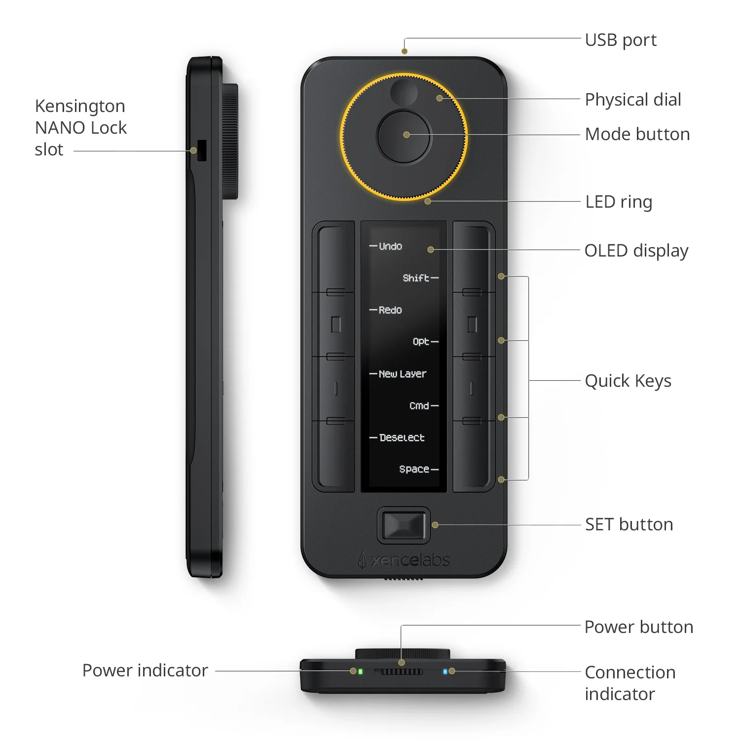 The Xencelabs Quick Keys enables artists to incorporate shortcut keys into their regular workflow through an easy-to-use interface. You can use the Quick Keys wired or wirelessly to a computer. A USB cable and a wireless dongle are included with your Quick Keys. Quick Keys is operational while being charged.