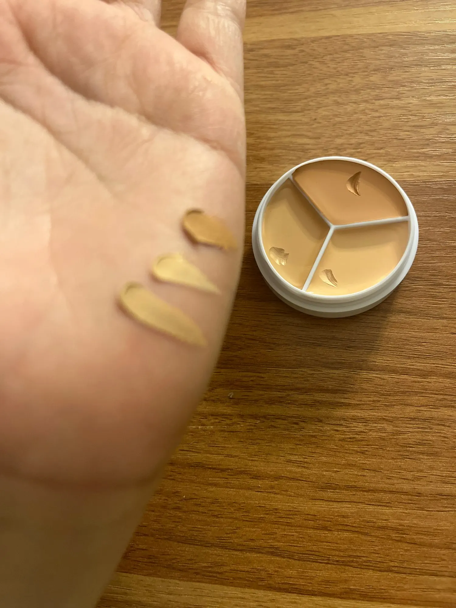 a creamy consistency, would say it’s great for dry skin, came in very quickly! the amount of concealer in each section gives me a bit of suspicion but i haven’t gotten any hives or rash from it yet.