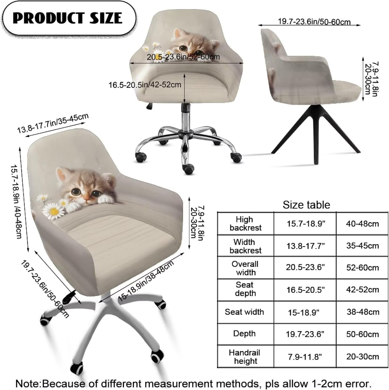 Fully Customizable Fit: Precisely adjust dimensions – seat depth (16.5″-20.5″), width (15″-18.9″), backrest height (15.7″-18.9″) & width (13.8″-17.7″), armrest height (7.9″-11.8″), plus overall width (20.5″-23.6″) and depth (19.7″-23.6″) – for a perfect, tailored look on your specific chair. (Measure before buying)