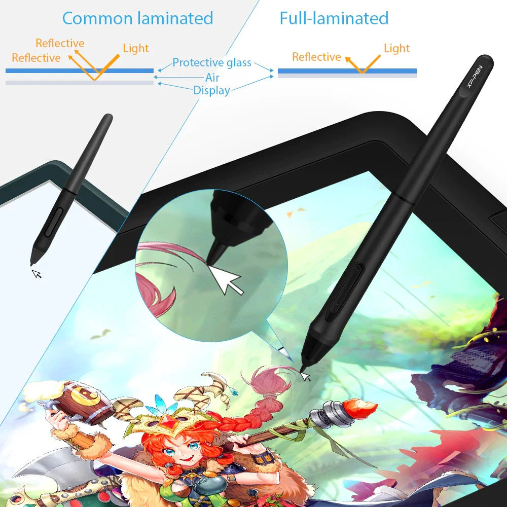 Full-lamination and anti-glare film reduce the space between the pen nib and the display, minimizing reflections for uninterrupted creative expression.