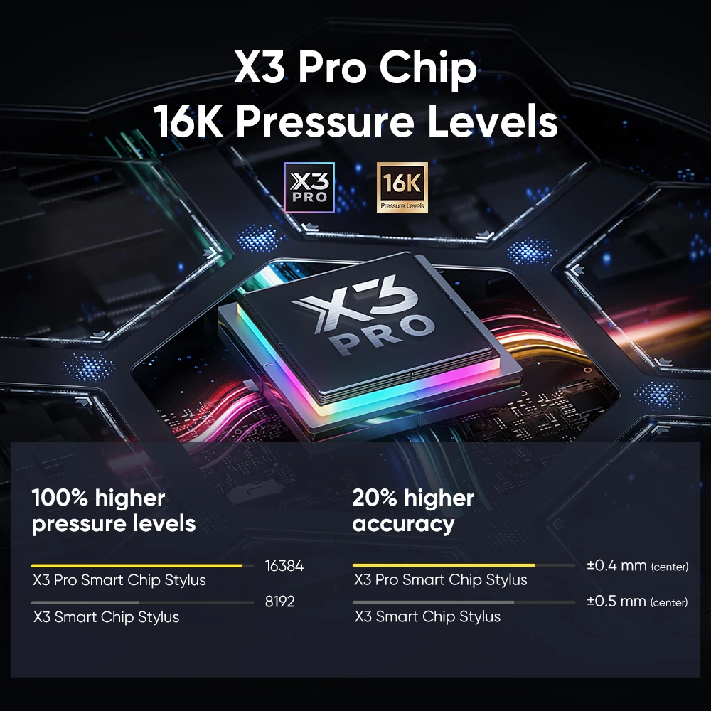 Introducing X3 Pro Smart Chip Stylus that features industry-first 16K pressure levels, 100% higher than that of its peers, for more precise and smooth lines than ever before — excelling at hyper-nuanced creation and beyond.