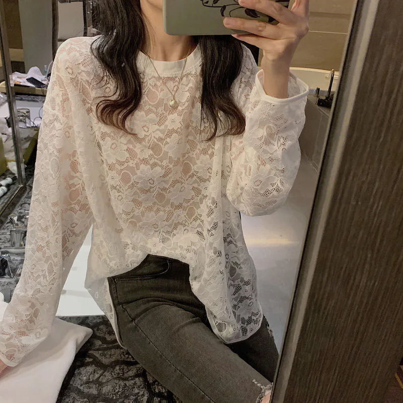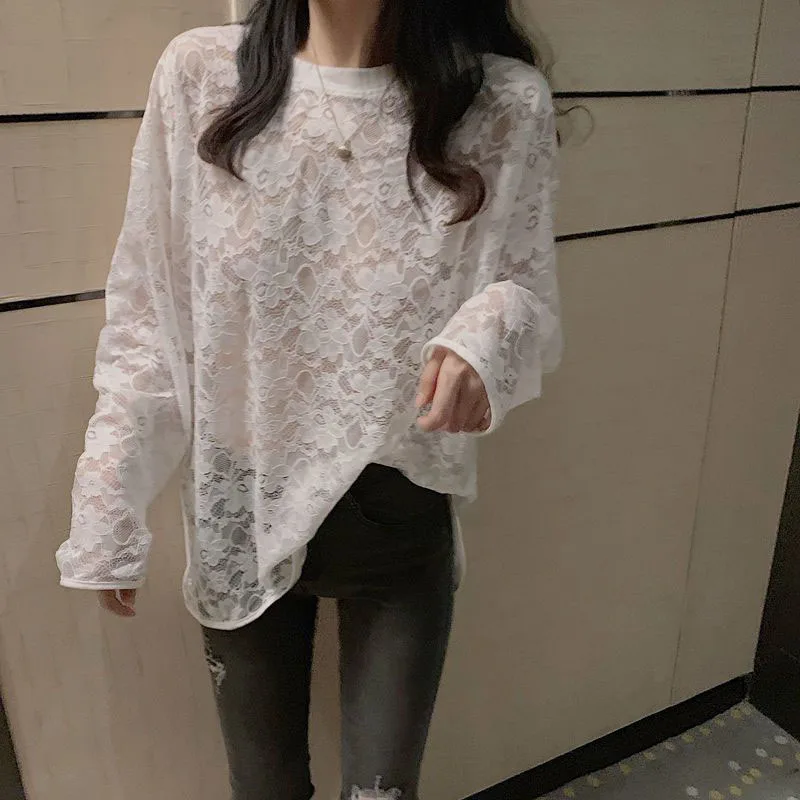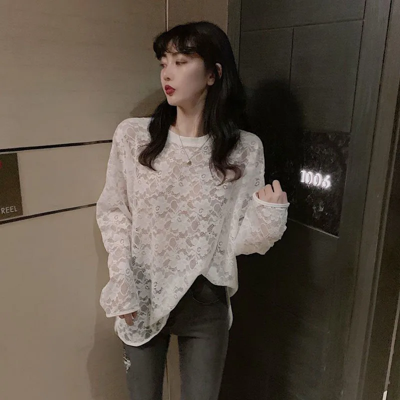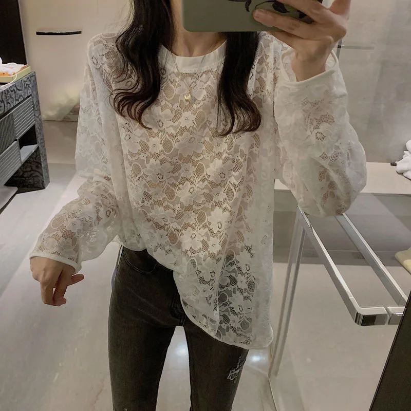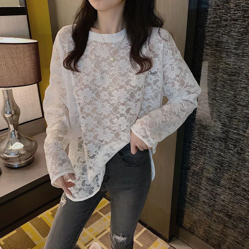 Xpqbb Korean Fashion Loose Lace Blouse Women All-match Sun Protection Hollow Out Shirts Female Summer Streetwear Smock Pullover