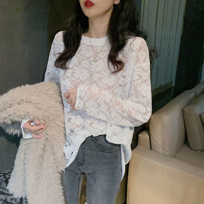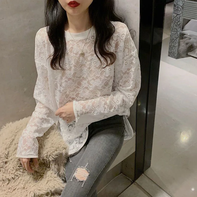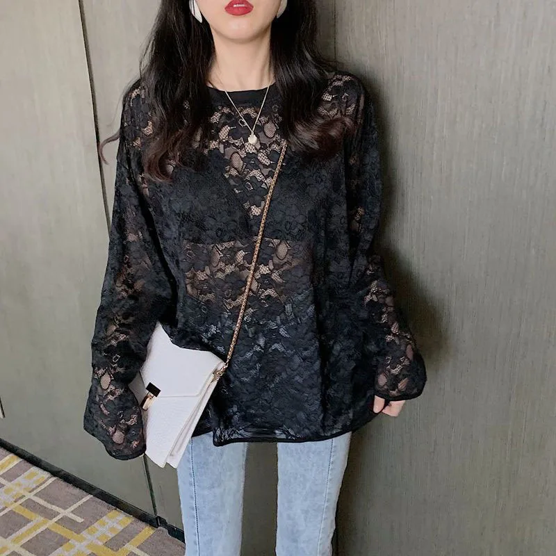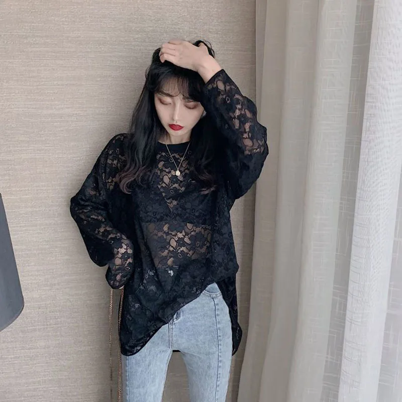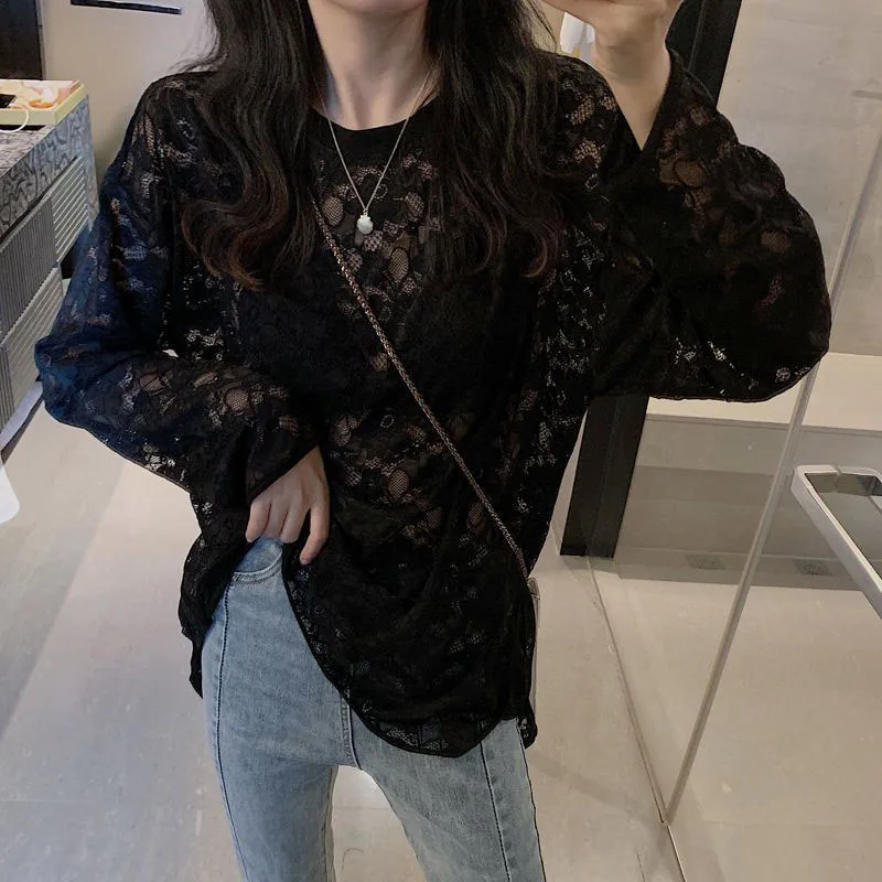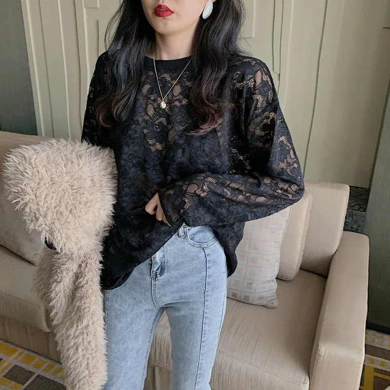 Xpqbb Korean Fashion Loose Lace Blouse Women All-match Sun Protection Hollow Out Shirts Female Summer Streetwear Smock Pullover