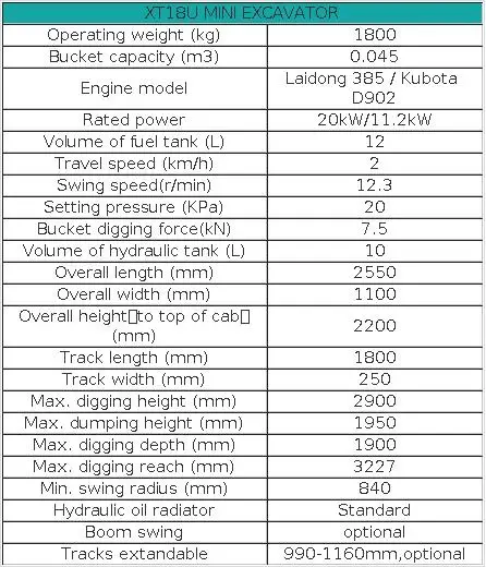 As a small mini excavator, XT18U is compact and lightweight, making it very suitable for working in a small space. Whether it is urban pipeline maintenance, street greening, or rural land consolidation and orchard excavation, XT18U can easily cope with it. Moreover, it can also be equipped with optional configurations such as Kubota D902 engine, steel crawler, boom side swing, chassis telescopic, cab, refrigeration and air conditioning, plunger pump, etc. according to user needs to meet the needs of different working conditions.