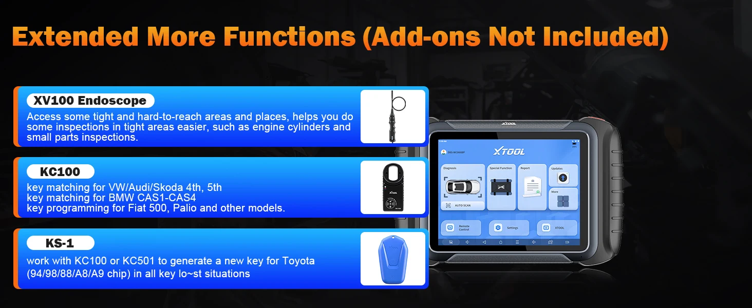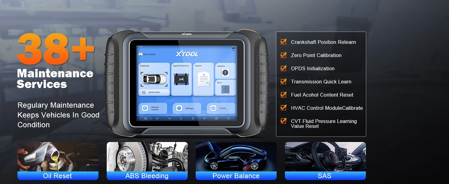 XTOOL D8S Automotive Scanner comes with comprehensive Special Functions: Oil Reset, EPB, SAS, BMS, Throttle, Injector Coding, ABS Bleed, Key Programming, A/T Match, Suspension, TPMS Reset, Headlight, Window, Seat, Power Balance, ABS Initialization, VSC Yaw Rate, SWS Calibration, Fuel Alcoho, Content Reset, Trans Fluid Counter Reset, Idle Relearn and etc. These special features allow OE-level full-system diagnostic tools to not only detect and repair common faults, but also perform complex system adjustments and optimizations to improve overall vehicle performance and reliability. Note: Special Functions do NOT work on all cars.