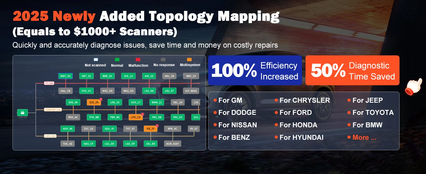 Note: Module Topology are not available to all vehicle makes for now. Available for GM, for CHRYSLER, for JEEP, for DODGE, for FORD, for TOYOTA, for NISSAN, for HONDA, for BMW, for BENZ, for HYUNDAI, for MAZDA and more to come.