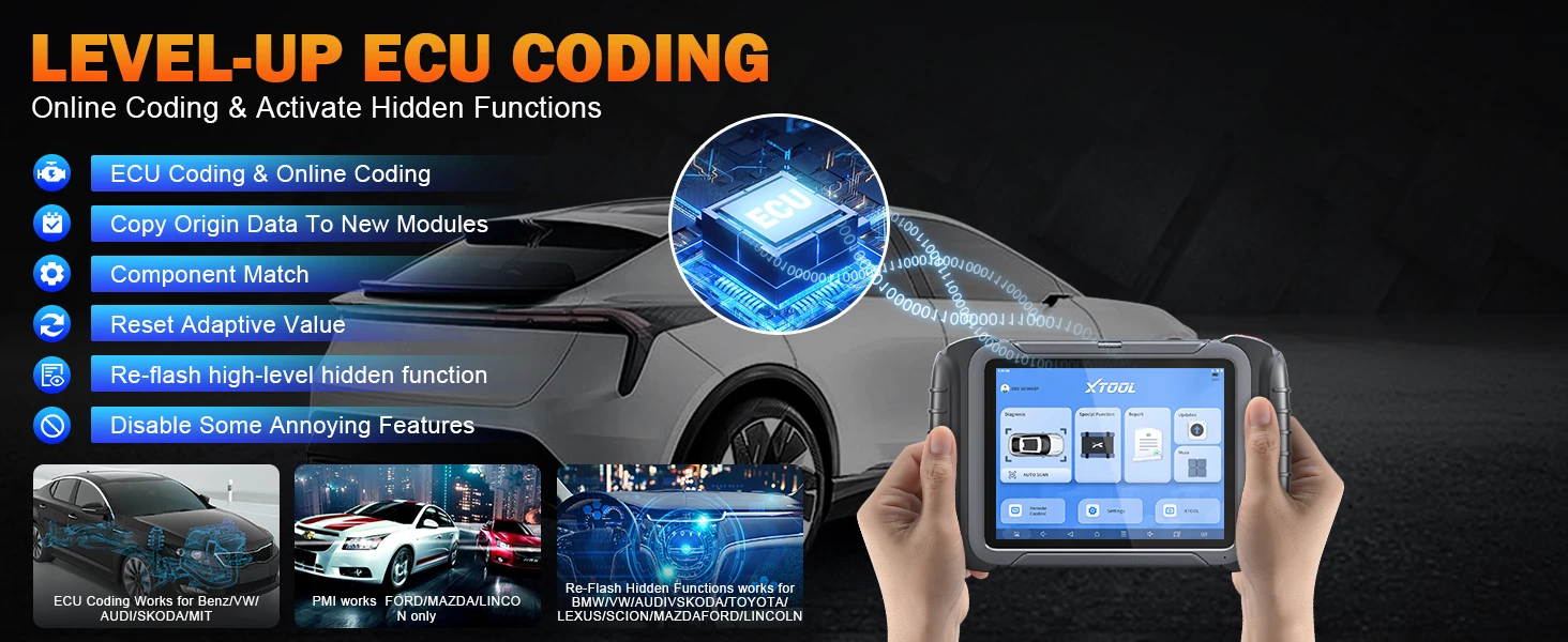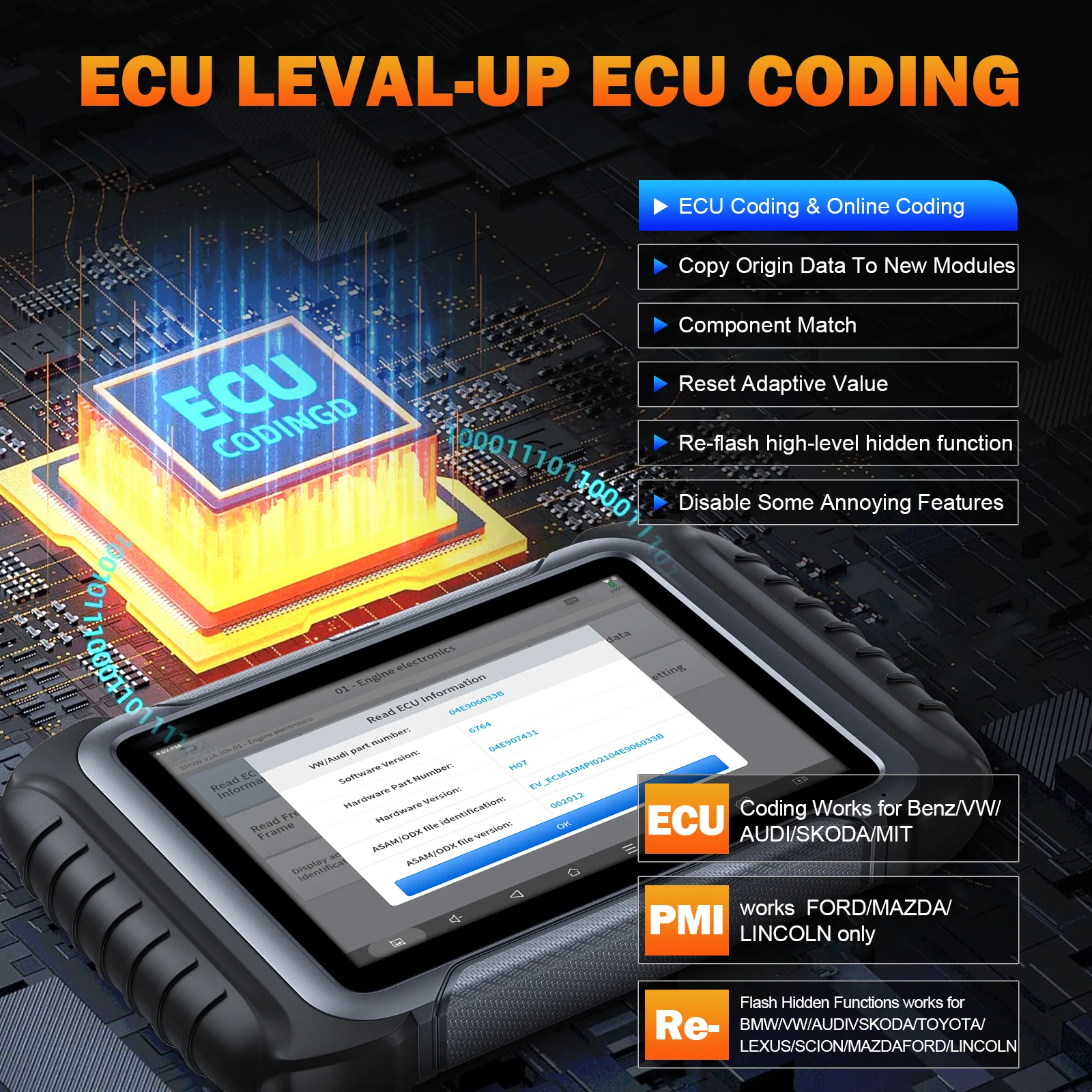 XTOOL D8S OBD2 Scanner Comes with ECU Coding for Audi, for VW, for Skoda to perform ECU Coding, Component Matching, Adaptive Data Reset; Flash Hidden Functions for Ford, for Lincoln, for Mazda, for BMW, for VW, for Audi, for Skoda, for Toyota, for Lexus, and etc. to optimize vehicle performance and customize car settings, like disable seat belt alarm/auto start_stop/daytime running light and maximum speed limiter, etc. ; PMI for Ford, Lincoln, Mazda to copy code into used modules.