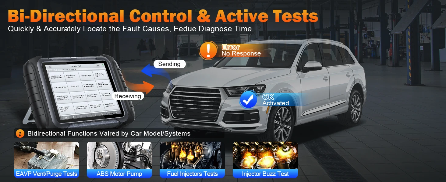 Bi-Directional Control in automotive diagnostics refers to a feature that allows a diagnostic tool to both send commands to and receive responses from a vehicle’s electronic systems. Enhanced ability to interact with and manage vehicle systems. By allowing commands and feedback, it supports comprehensive testing, precise diagnostics, and efficient repair and maintenance procedures. It enables the tool to actively interact with vehicle components and systems in real-time.