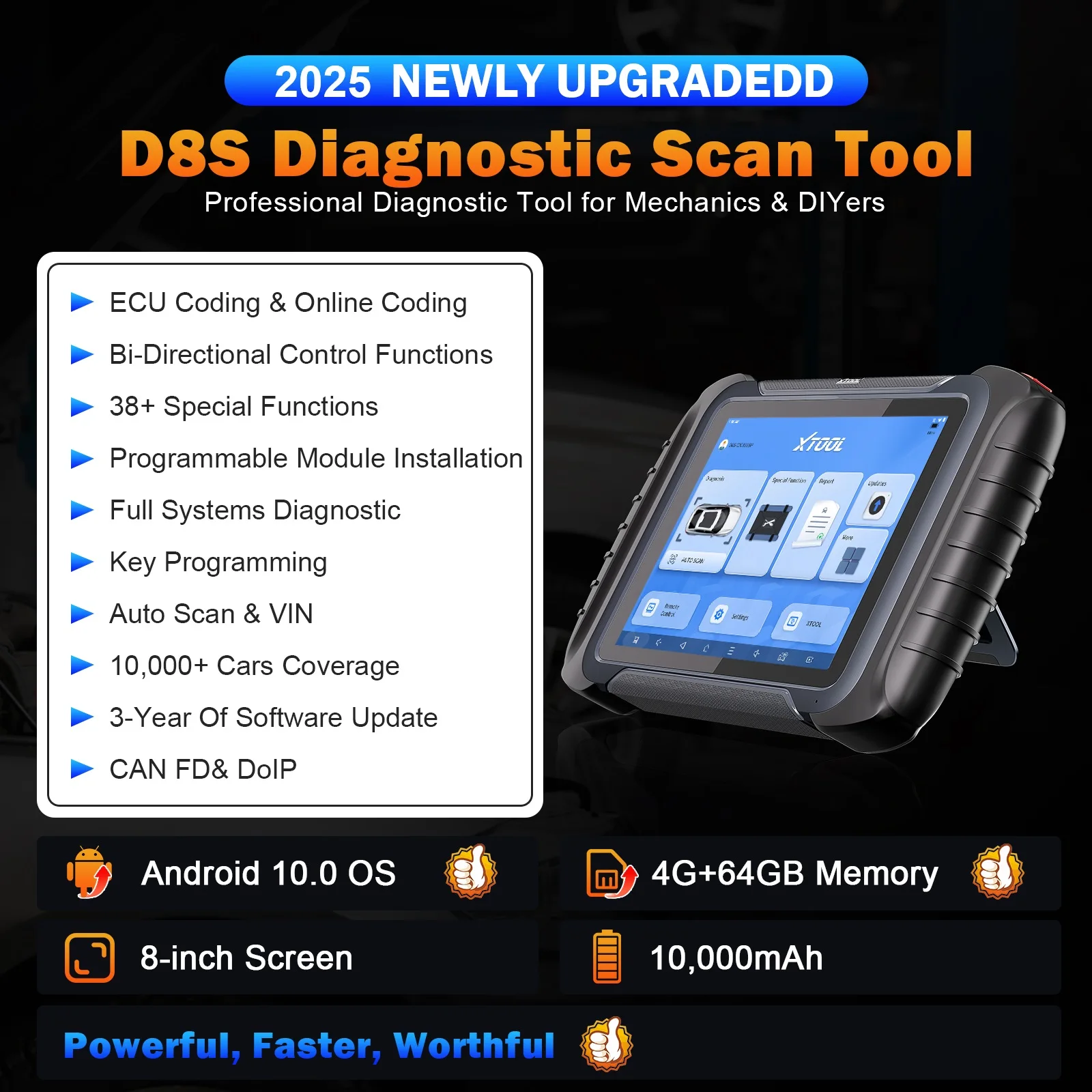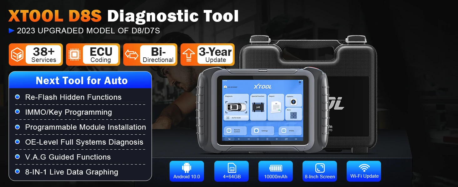 XTOOL D8S Automotive Scanner – Top Upgraded Ver. of the XTOOL D8–2025 newest all-in-one automotive diagnostic scan tool has packed all capabilities auto technicians would ever need for daily repair & maintenance services: ECU Coding for VW, for Audi, for Skoda; PMI for Ford, for Lincoln, for Mazda; ECU Configurations, 38+ Services Resets, Relearns, Initializations, Adaptations, Bi-Directional Control, OE-Level All Systems Diagnosis, Export Data & 8-In1 Graphing, 10,000 Car Coverage, CAN FD & DoIP Protocol, Android 10, Works with Key Programmers/Endoscope/EEPROM adapter all into this 8” diagnostic tablet.