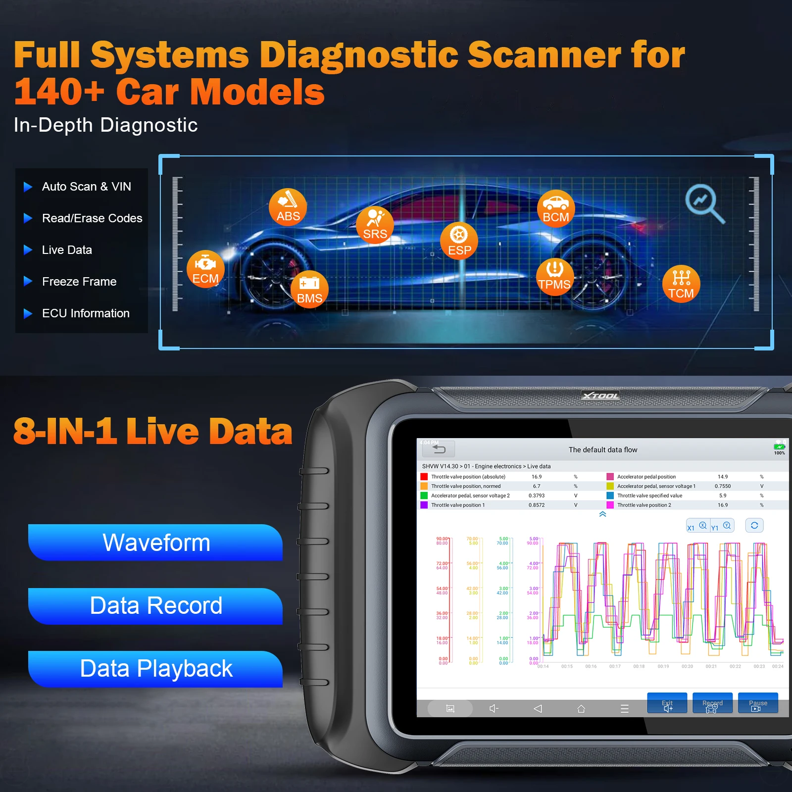 XTOOL D8S Scanner can scan all available vehicle systems like Engine, Trans, ABS, Airbag, Brake, Body, Chassis, HVAC, Radio and etc to perform dealer-level diagnostics: read/clear DTCs, data stream & graphing like fuel trims/misfire/trans oil temp/ mass airflow/ clutch sensors/ O2 sensors/ ABS speed sensors, export data as CSV, and active tests(bidirectional controls), retrieve freeze frame & ECU info and turn off warning lights/reset monitors on various systems.