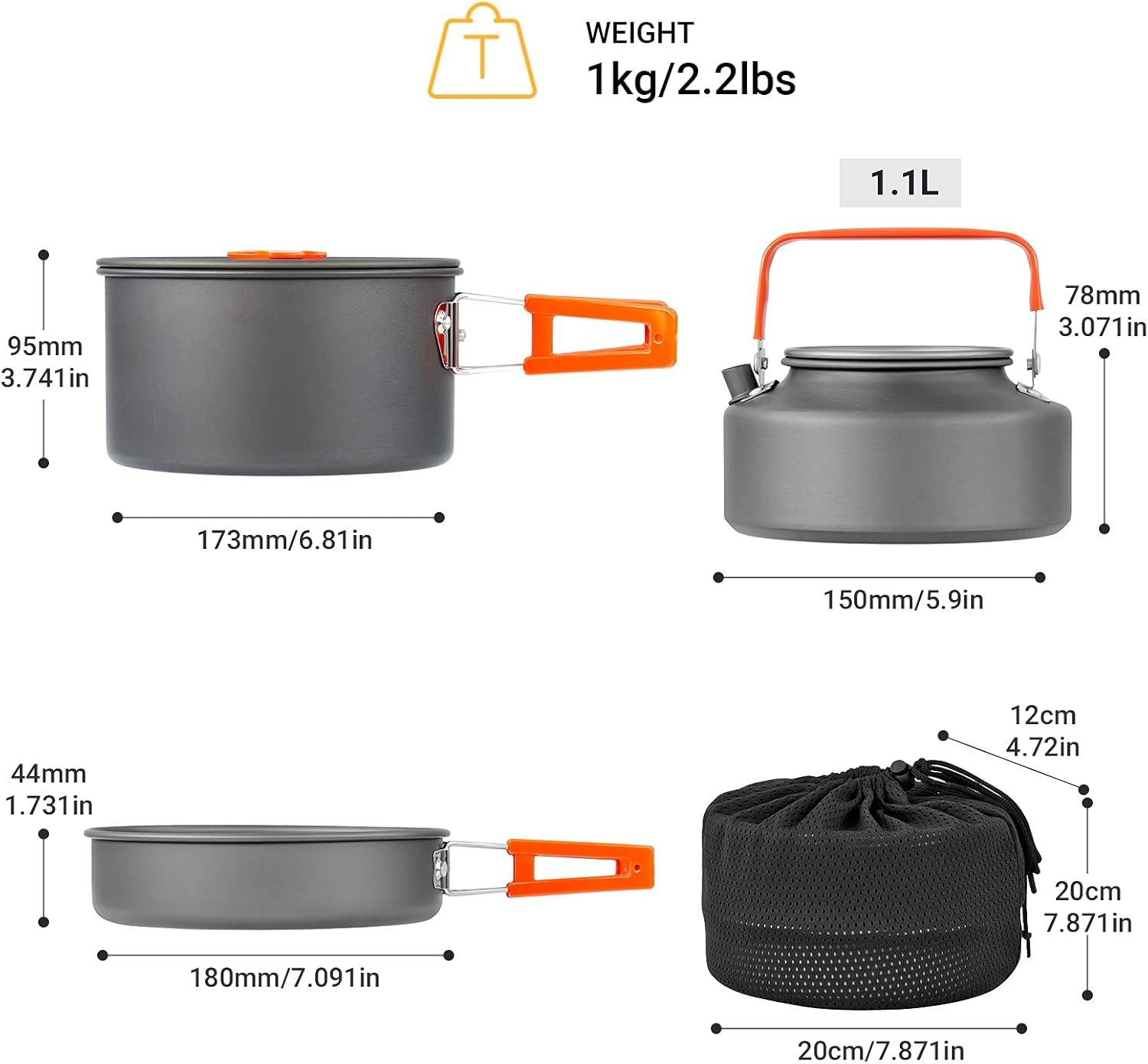 🎁QUALITY MATERIAL AND EASY TO CLEAN🎄: The camping cook sets are made of food grade Hard-anodized Aluminum which is safe, heat transfer and scratch-resistant. All the pot, pan and kettle can be not only used with gas tank but also firewood