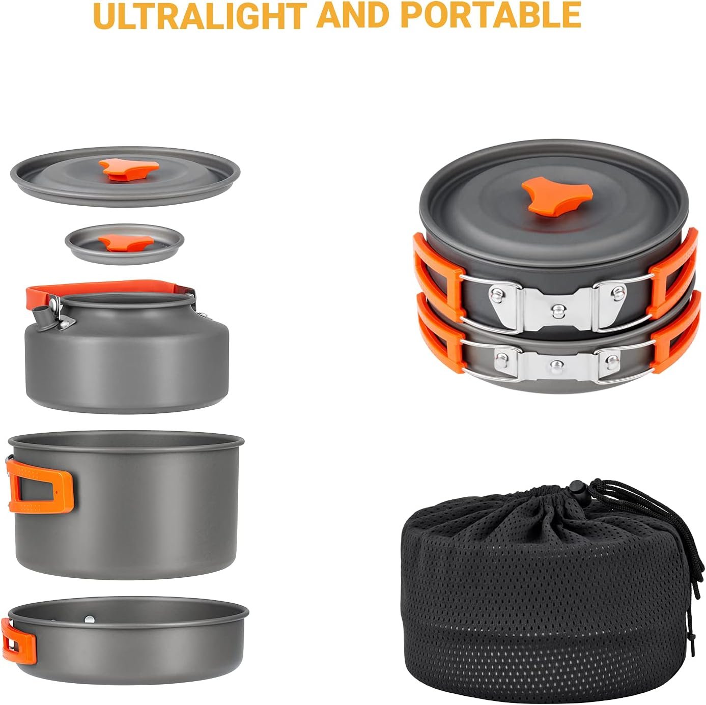 YETO Camping Cookware Set Hard-Anodized Aluminum Foldable Backpacking Camping Pots and Frying Pans Cooking Camp Kitchen Camping Mess Kit Eco-Friendly Cooker Set for 2-3 Persons,MediumGrey