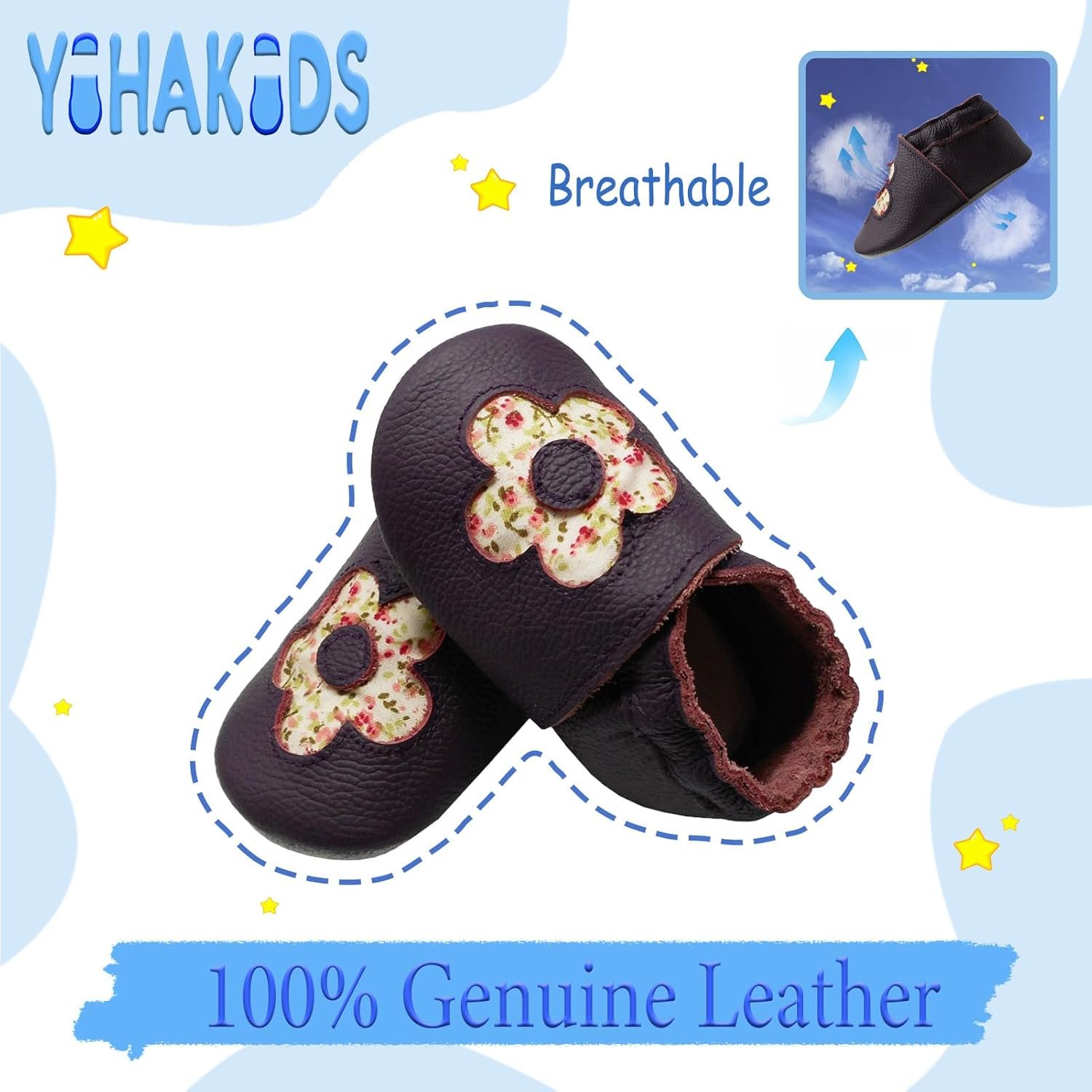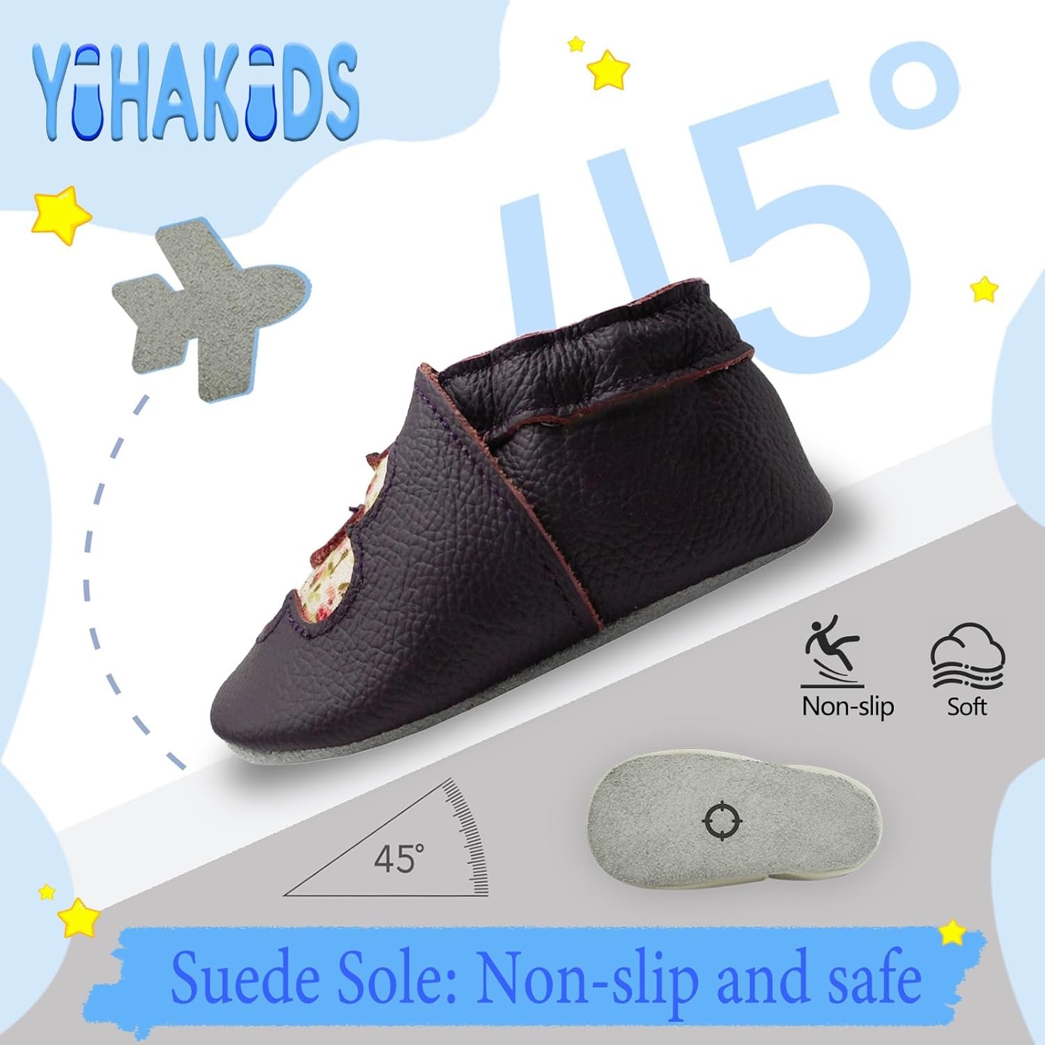 The YIHAKIDS shoes are made of genuine leather, the material is natural and chemical free.The soft texture of cowhide is soft and breathable, the suede bottom could provides a