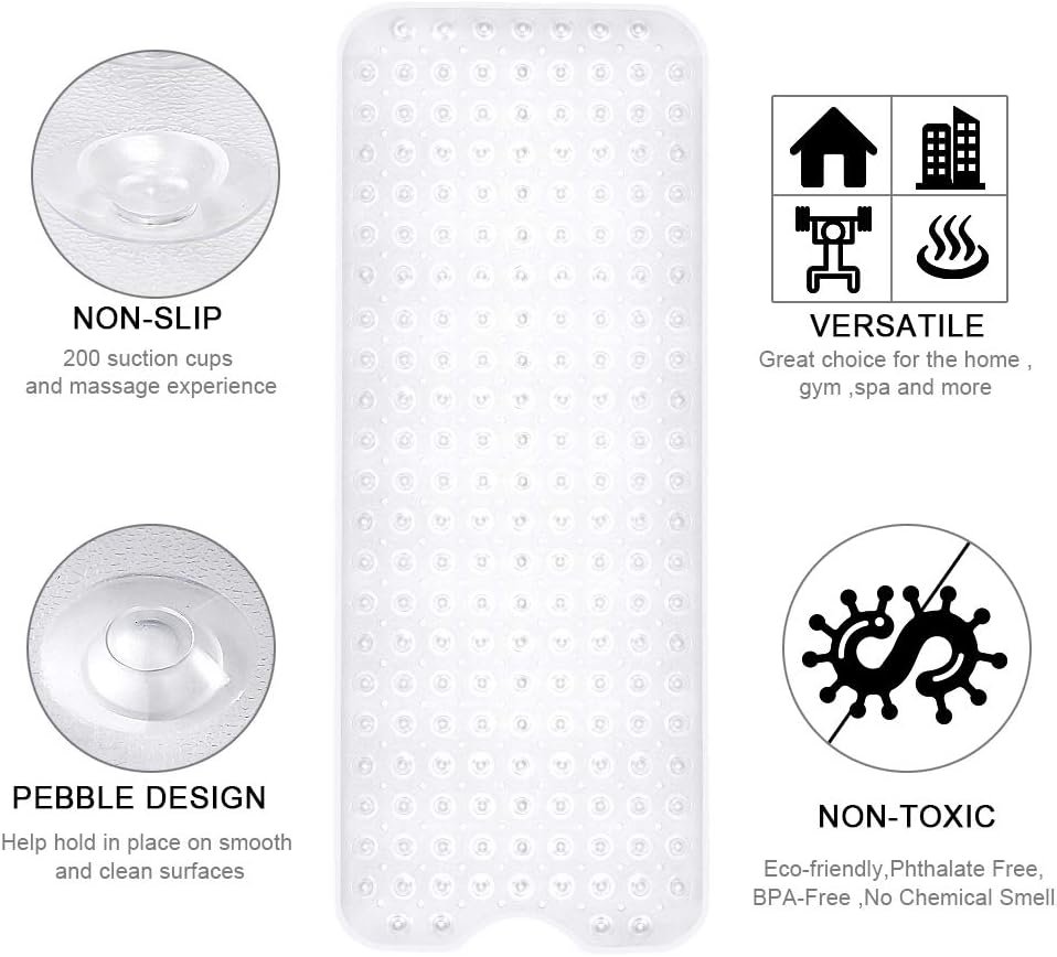 Multifunctional and utility: looks like pebble design, provide massage experience in shower time as it comes with 200 suction cups, featuring necessary anti-slip function, meanwhile YINENN extra large mat is 40 inch x 16 inch which provides excellent coverage and also features small holes throughout to allow water to circulate.