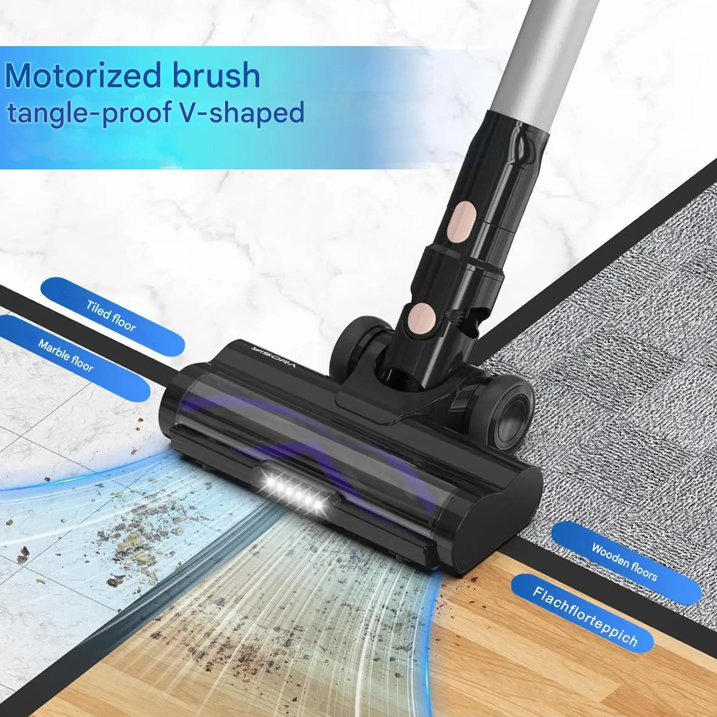 â€Â»Cordless vacuum cleaner : Electric brush head with LED lamp beads The 6-in-1 cordless vacuum cleaner can flexibly swivel 150° sideways and 90° forward and backward, and the LED lamp beads of the electric brush head can illuminate dark corners, allowing you to easily clean every corner of hard floors, carpets, stairs, keyboards, sofas, cars, etc.