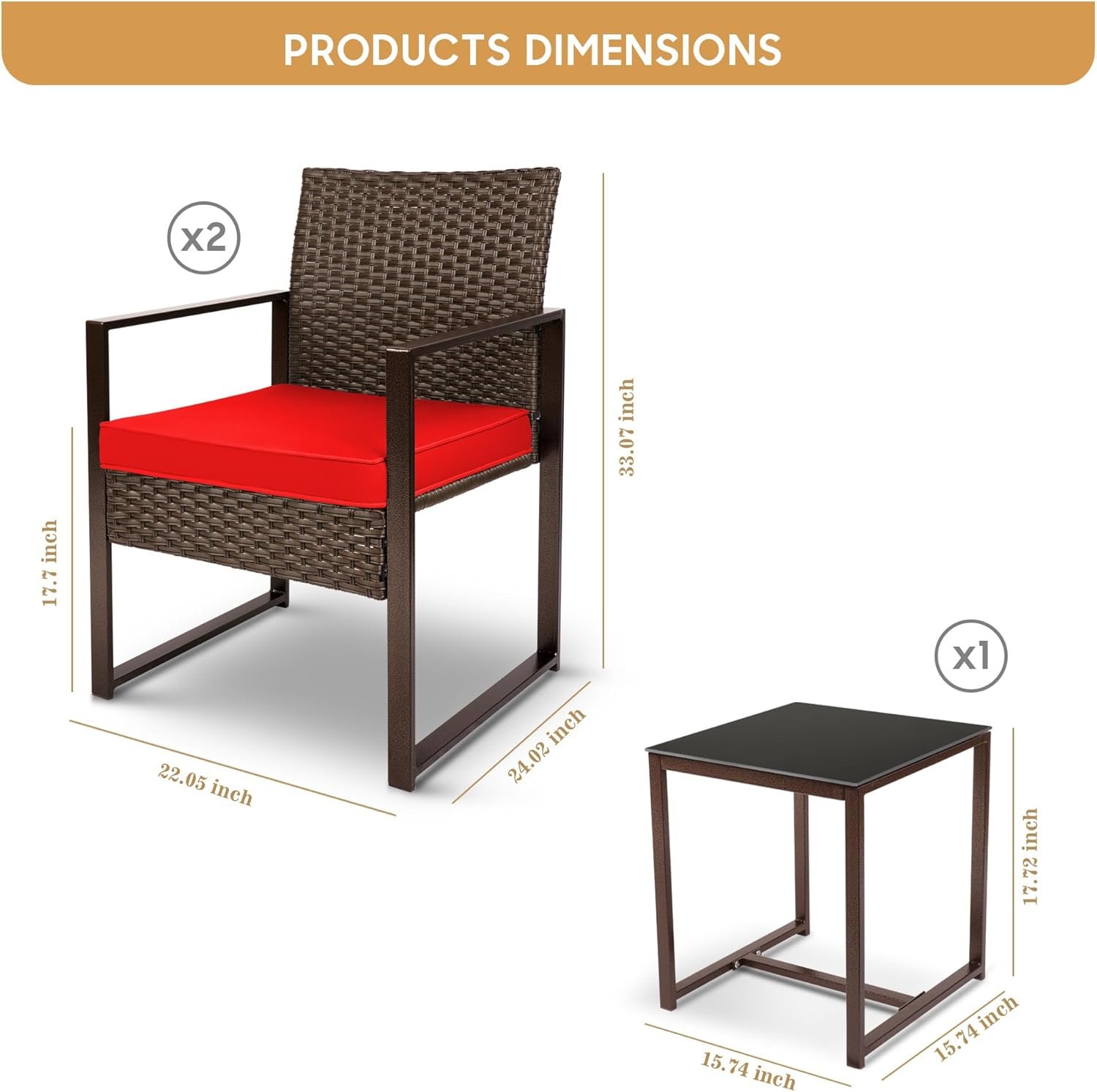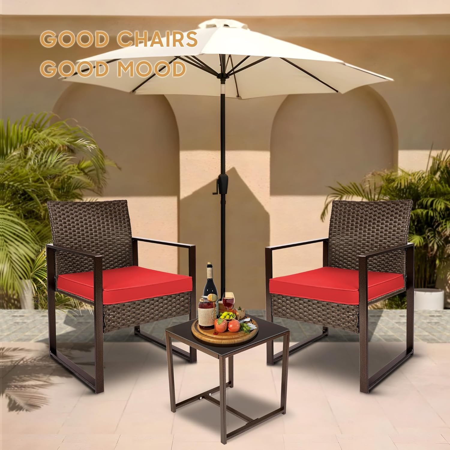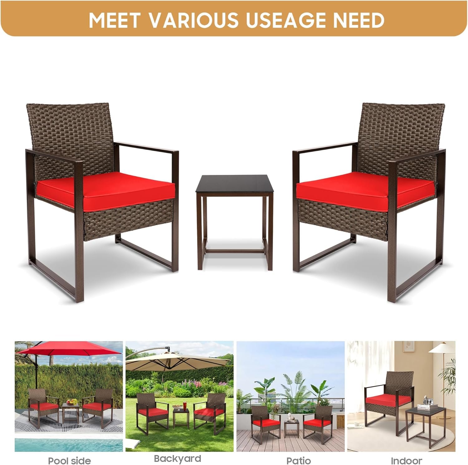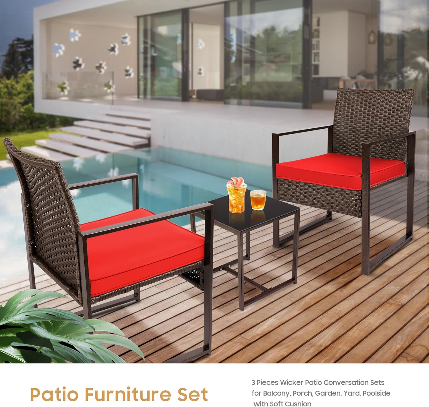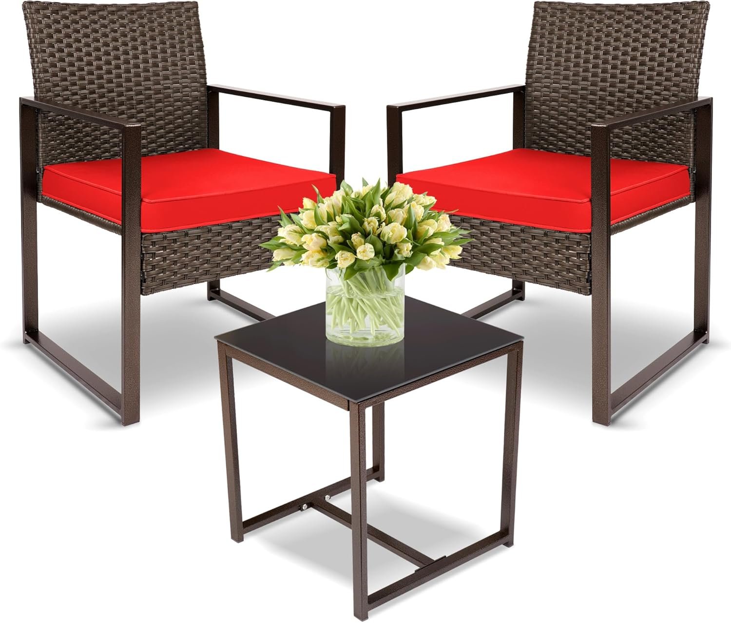 YIYAN 3 Pieces Outdoor Furniture Set Patio Rattan Wicker Chairs & teatable,Lawn Garden Balcony Backyard,with Washable Cushion (Red)