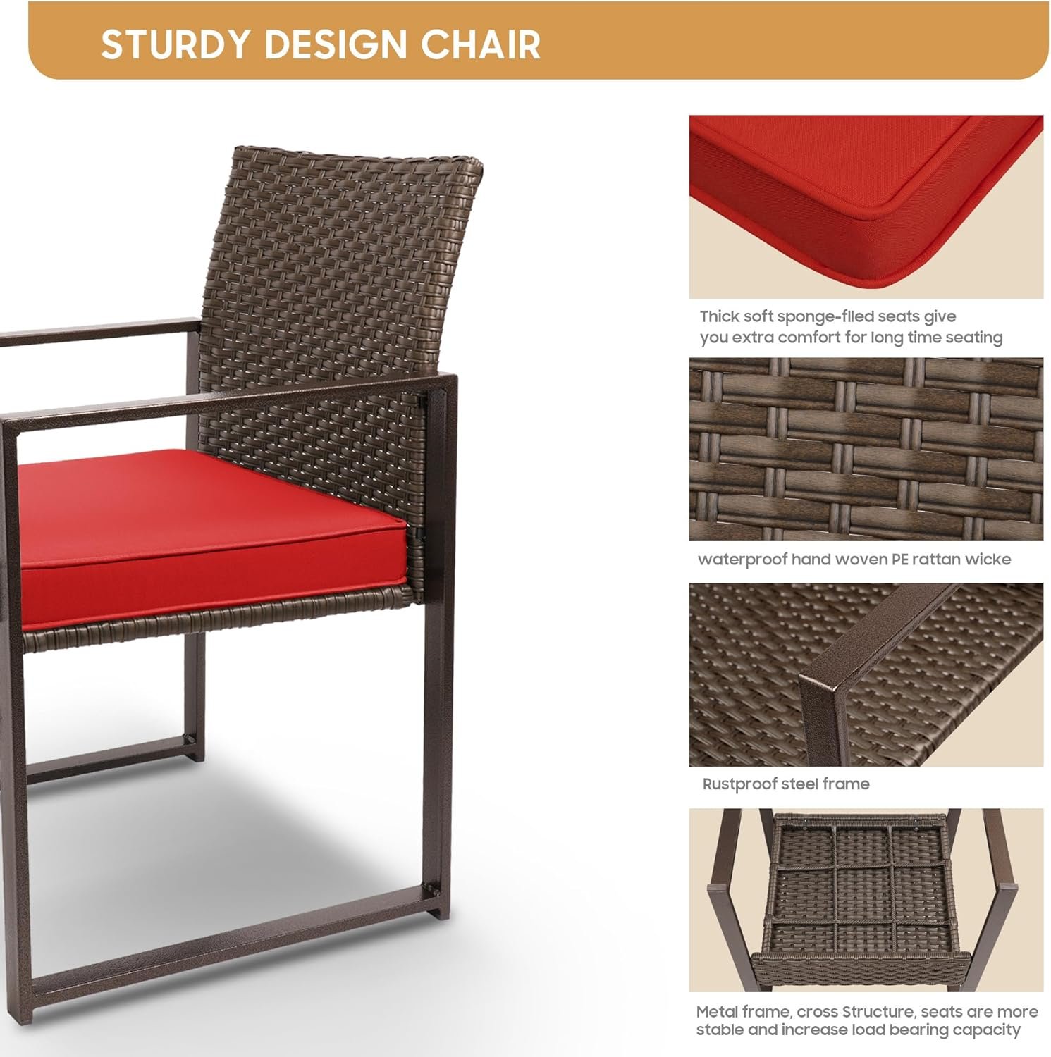 The garden Furniture Set frame is Made of high-quality steel and premium PE rattan,The cushion is 180g polyester cloth with 18-20D6cm sponge and can be removed and Easy to clean with zipper.