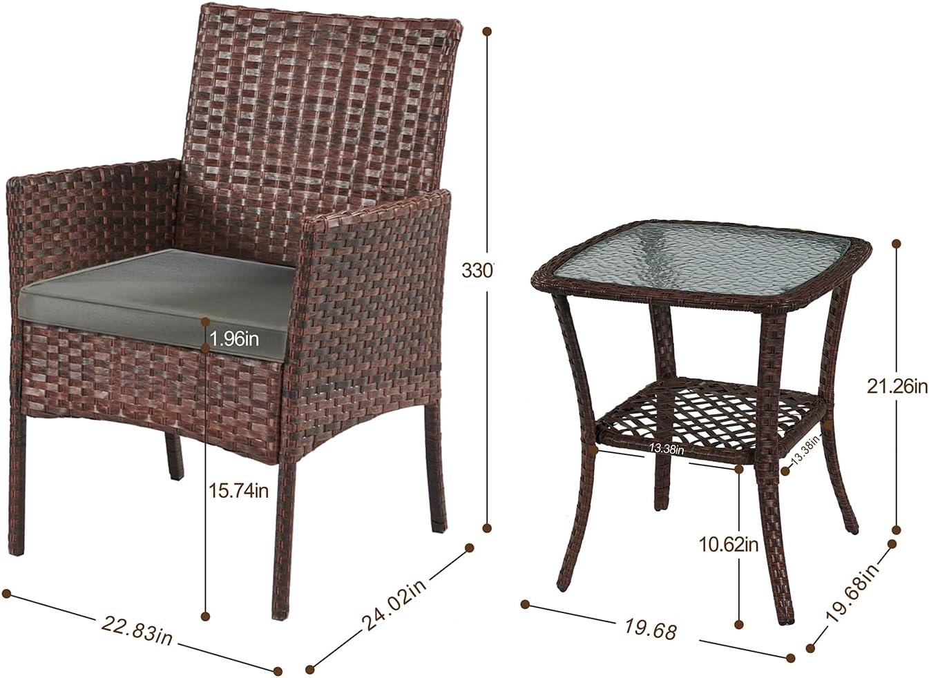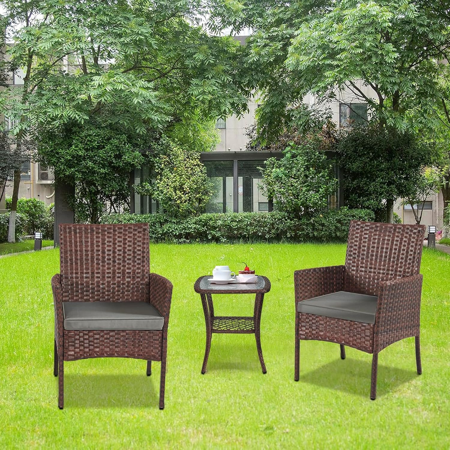 The furniture set include two Chairs ,one galss table and two removable and washable cushions This two Chairs is made of a metal structure that makes it durable and robust. The cushion cover is waterproof and removable. So it can be used even on a rainy day. There is a coffee table for displaying books, tea, coffee or flowers.