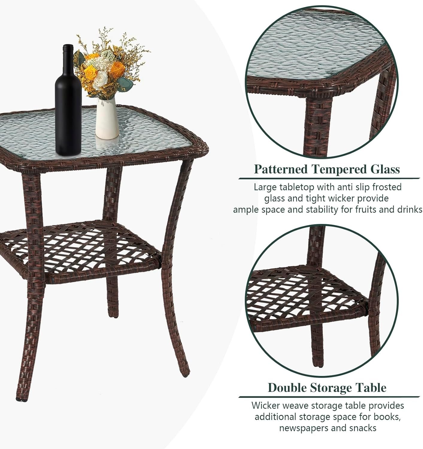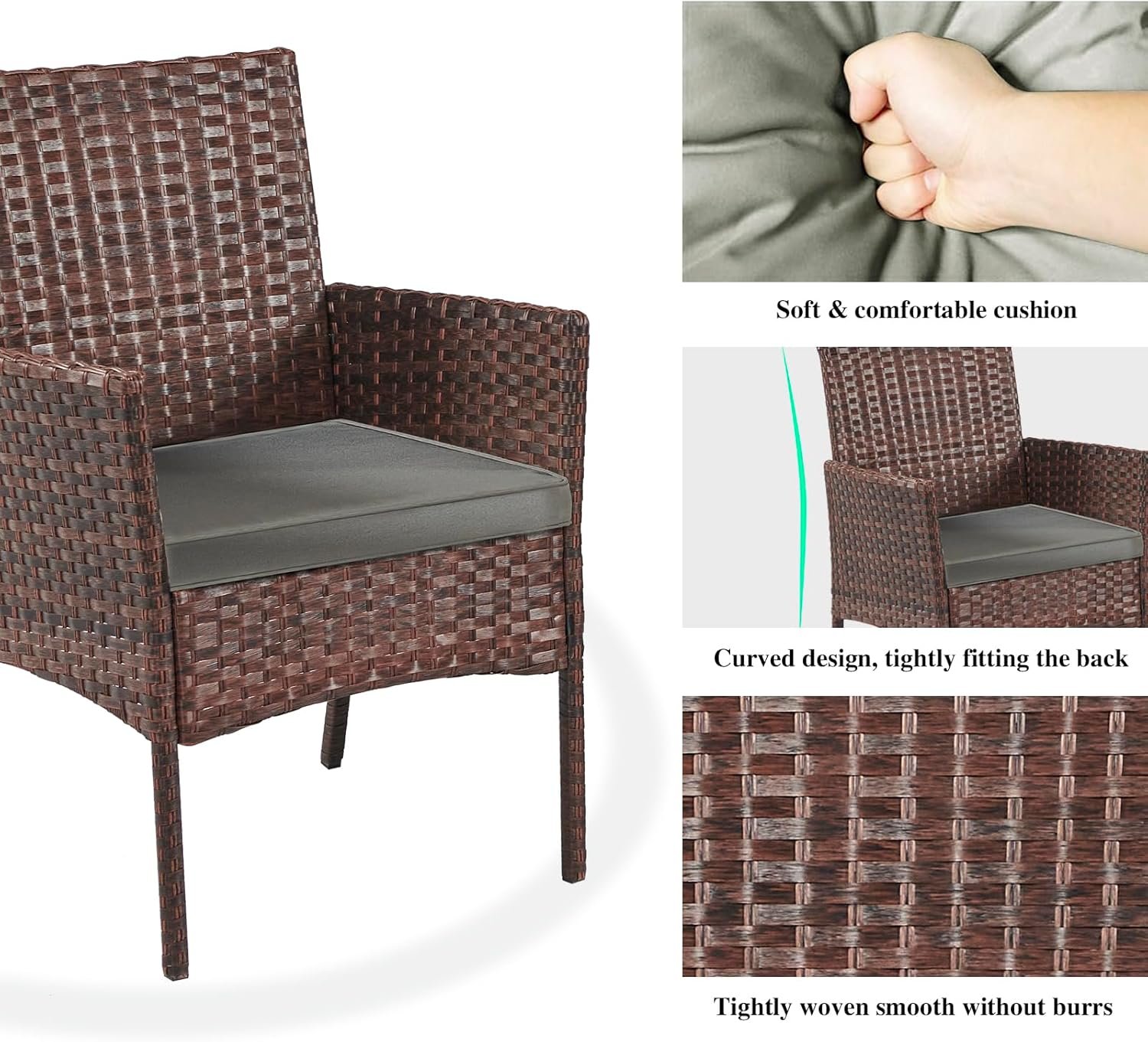 The garden Furniture Set frame is Made of high-quality steel and premium PE rattan,The cushion is 180g polyester cloth with 18-20D6cm sponge and can be removed and Easy to clean with zipper.