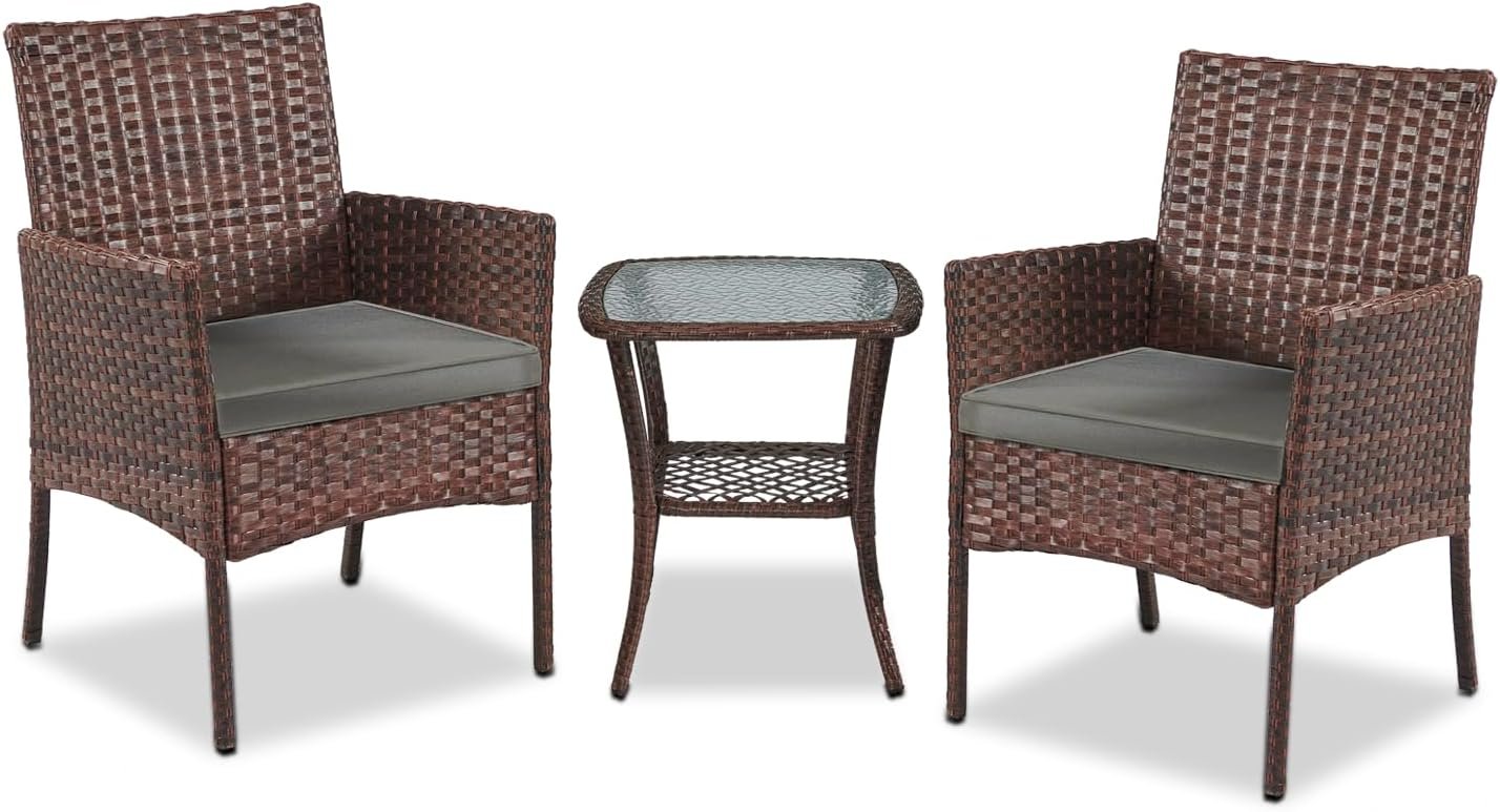 YIYAN Garden Furniture Set 3 Pieces Patio Rattan Wicker Chairs,Patio Porch Outdoor Furniture Set with Chairs, Coffee Table and Washable Cushions (Gray)