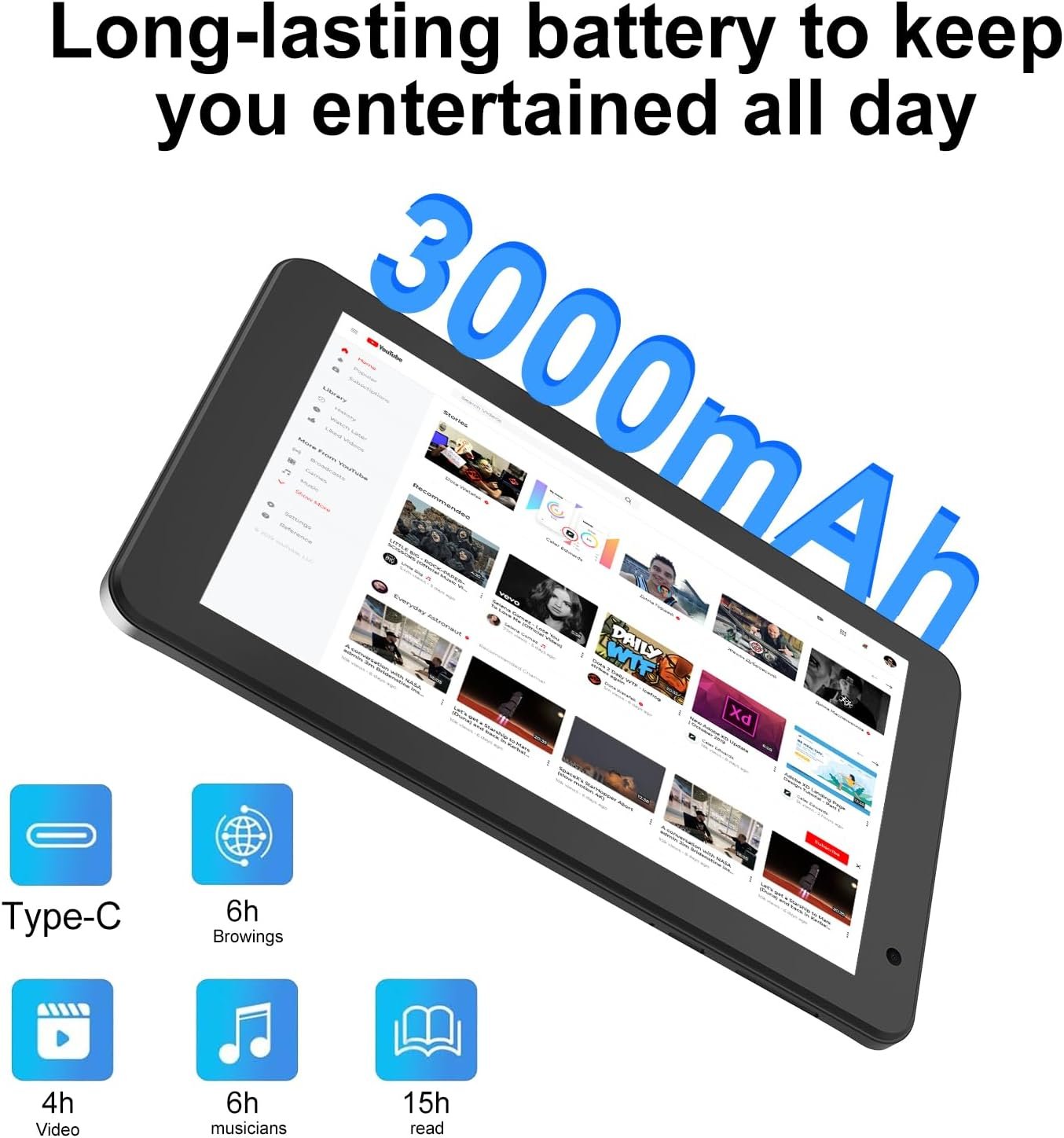 7 inch TabletAndroid 124GB RAM + 32GB ROM Storage3000mAh Battery for more than 6-8 hours use