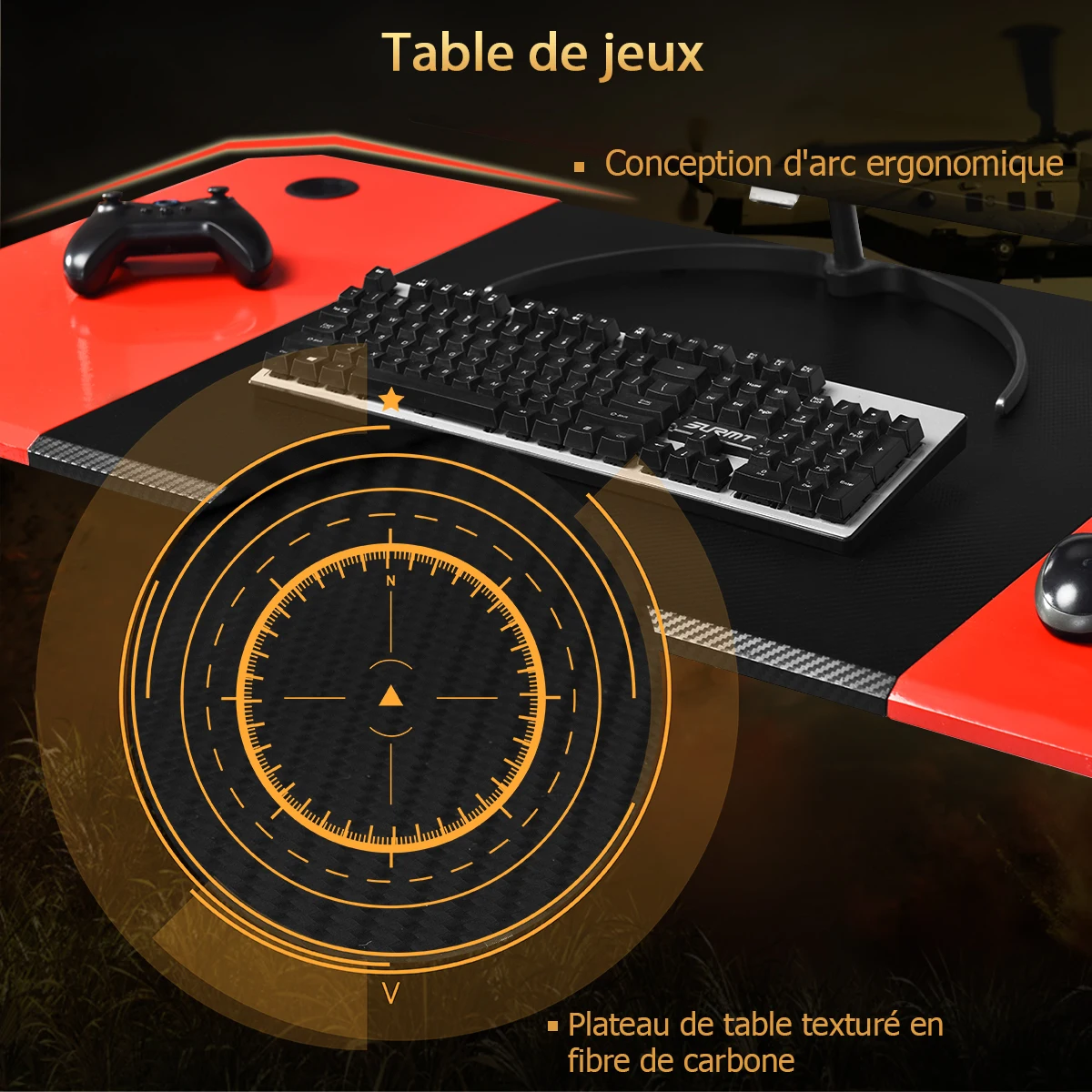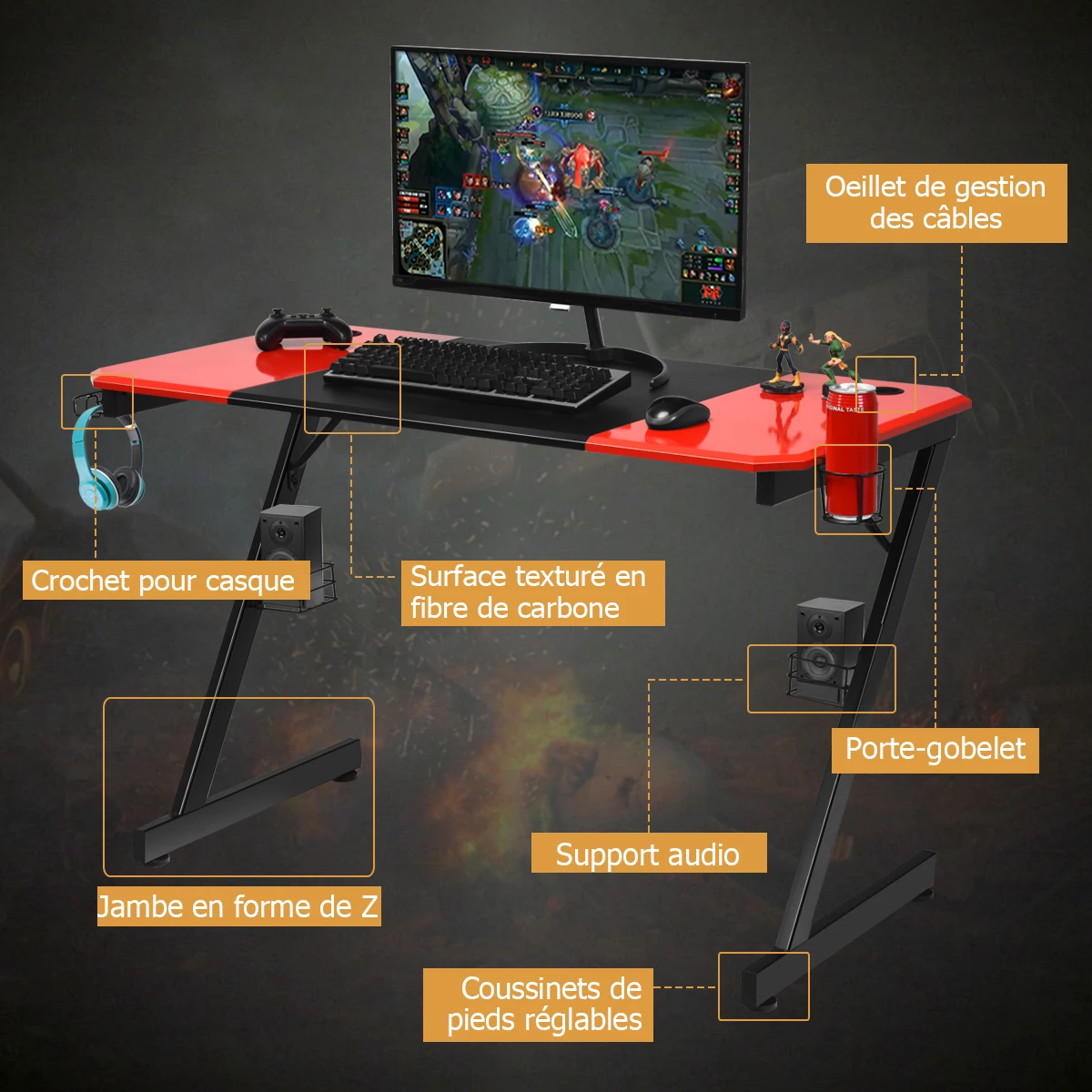 Are you currently establishing yourself in the gaming scene and want to achieve goals in eSports leagues? Our gaming table can optimally support you here! With its sturdy metal scaffolding and MDF panels as well as the equipment with a mug holder, A hook for your headset and two stands for boxing, our gaming table allows you a perfect and comfortable gaming experience. The tabletop offers spacious space for your monitors, keyboard, mouse and other equipment. In addition, the stable Z-shape of the frame and the smooth surface made of carbon fibers offer a comfortable sense of use. The table can also be used as a desk for writing texts and reading. It can also be easily cleaned only with a damp cloth and can be assembled in a very short time. This table can perfectly support you to fully enjoy your games and achieve the desired success and significantly increase the fun of gaming.