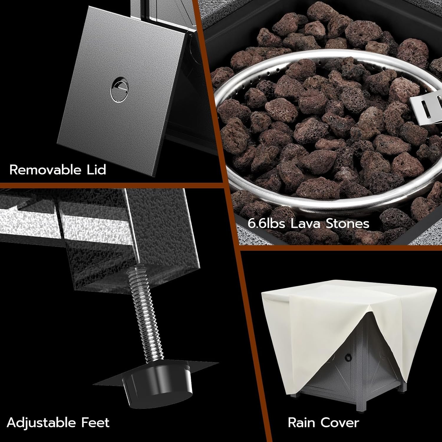 【Complete Accessories】The product came with a fire table with burner lid, waterproof fire cover, rain cover, 6.6 pounds of lava stone, accessory kit and product manual. It should be noted that the waterproof fire pit cover is not rainproof, and do not put the rain cover on the desktop at high temperature, which is easy to leave water stains below the desktop.