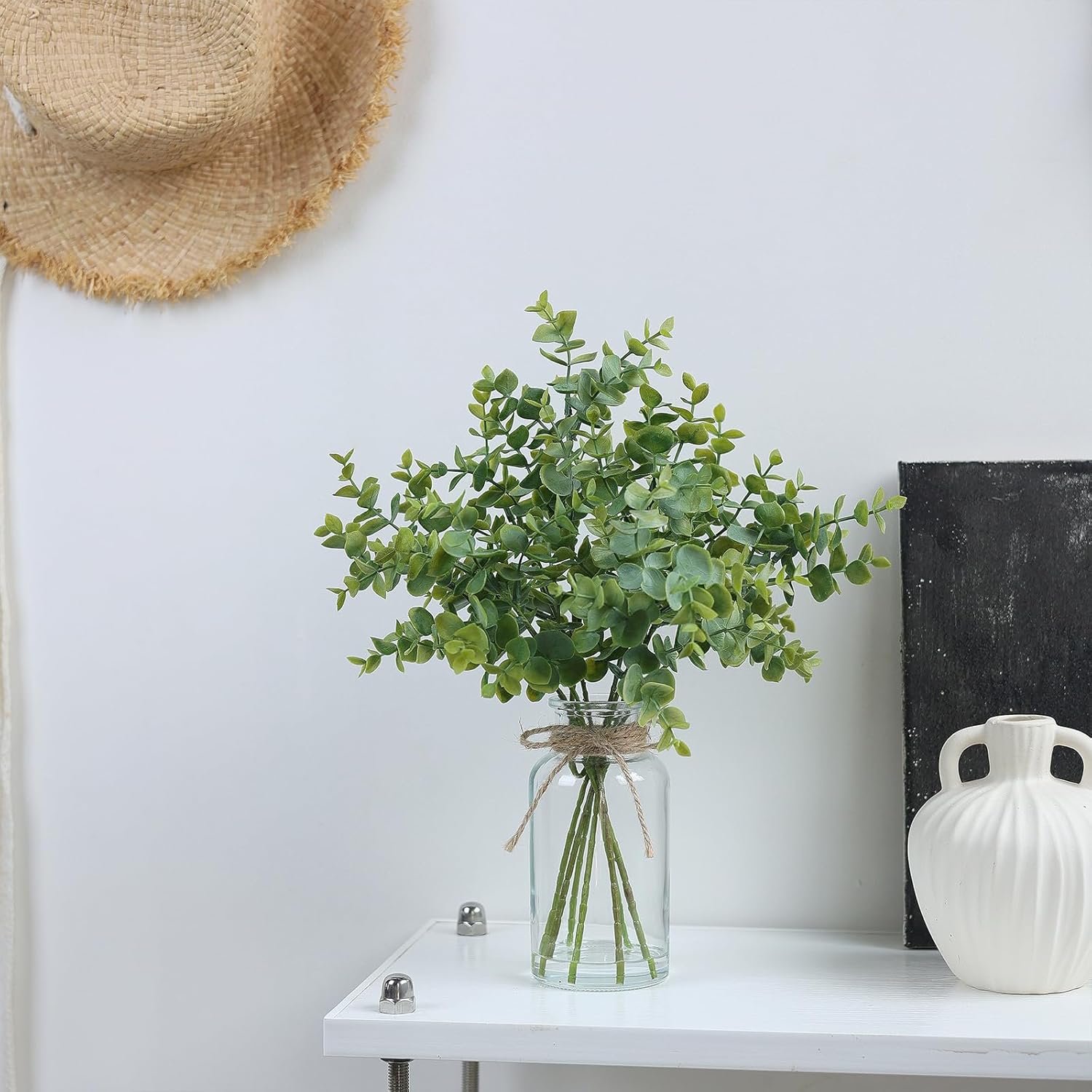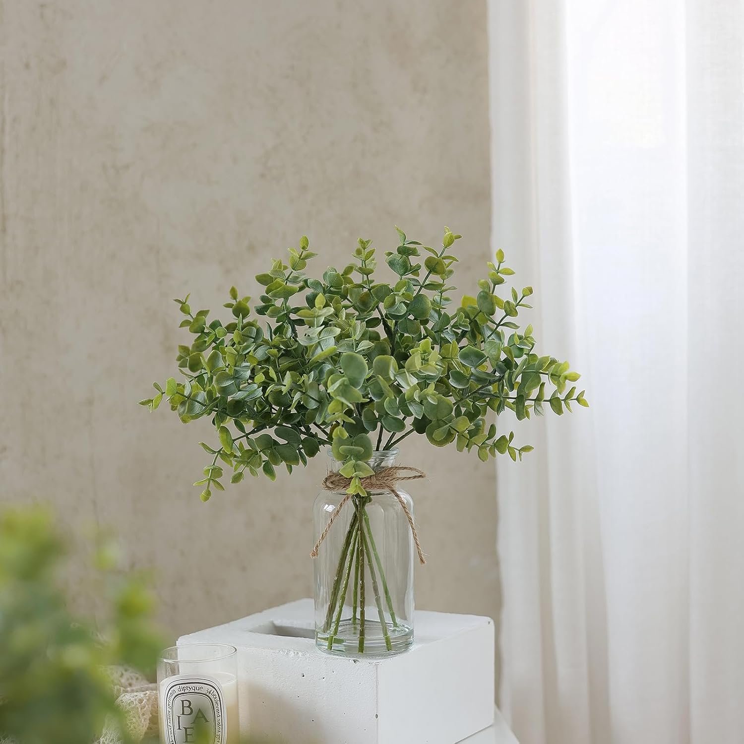 【Lifelike Artificial Eucalyptus】: A safe and durable quality material, the eucalyptus leaves of the fake plant are made of environmentally friendly plastic. Bright colors and realistic leaves paired with glass vases with fake water make these fake plants more life-like and look more natural.