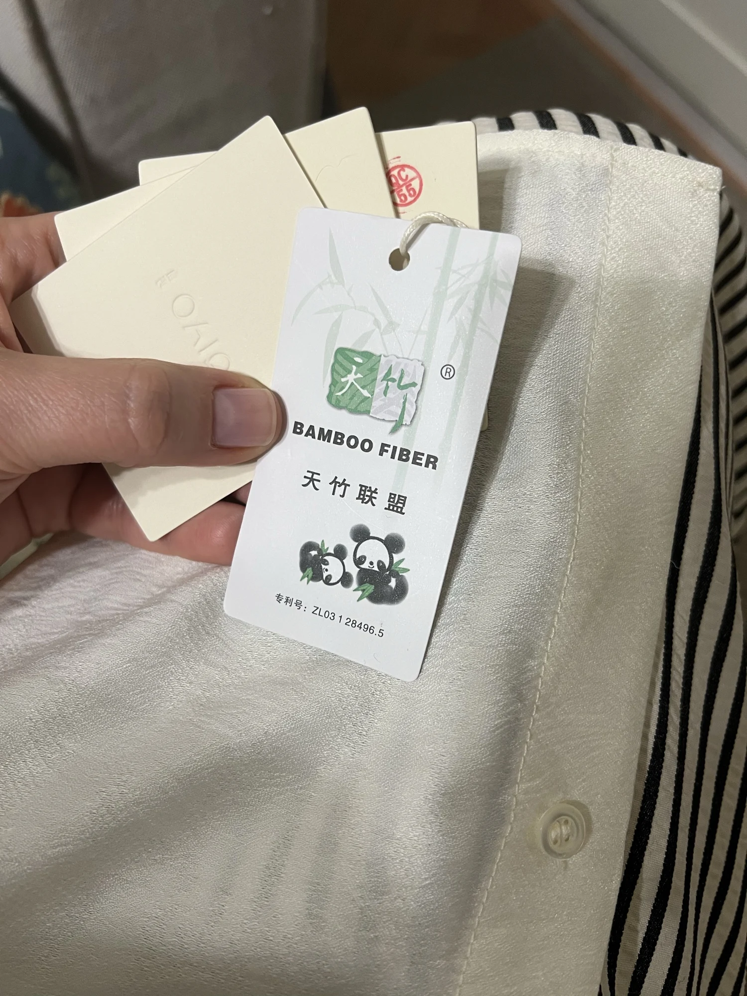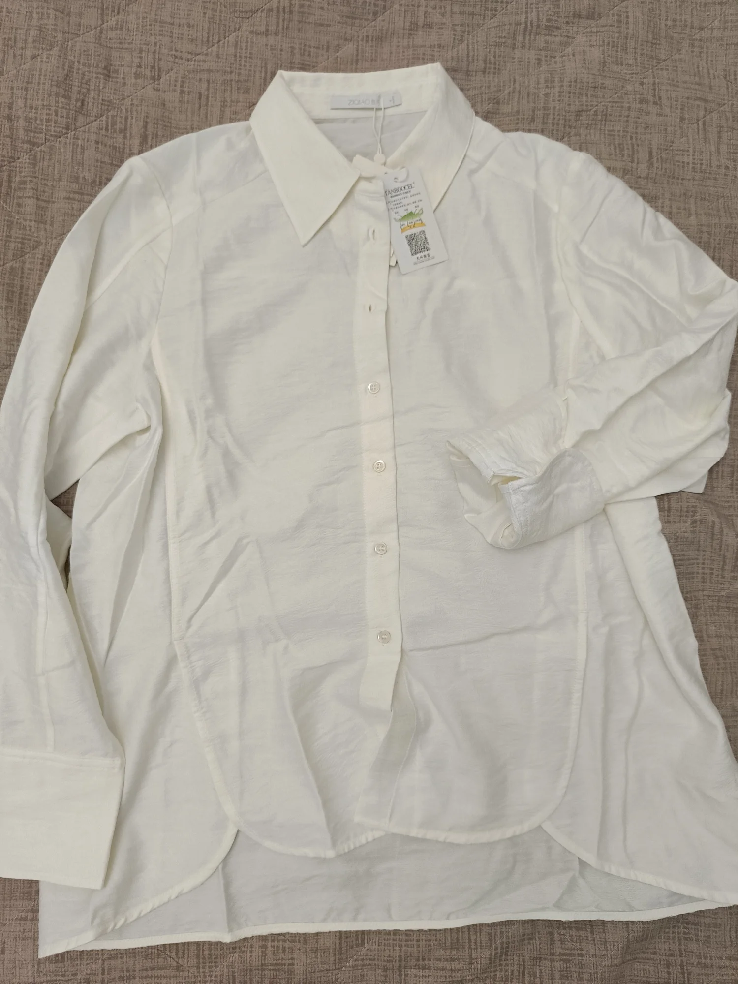 I ordered this shirt for the second time (to replace the damaged one). I am very pleased with its quality and design; I have attached a photo below showing how it fits. This time I will attach a photo with the composition. For some reason, there was a tag about bamboo fiber in the composition, but there is not a word about bamboo fiber on the shirt tag. Also, the shirt comes with a spare pearl button and thread.