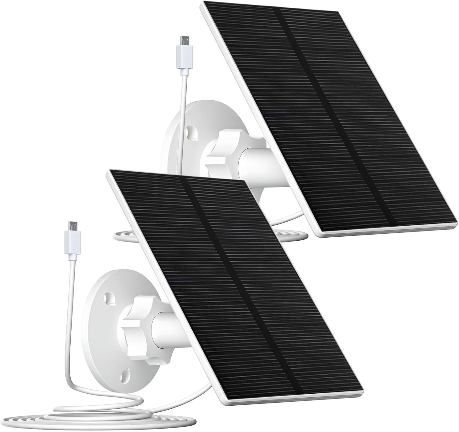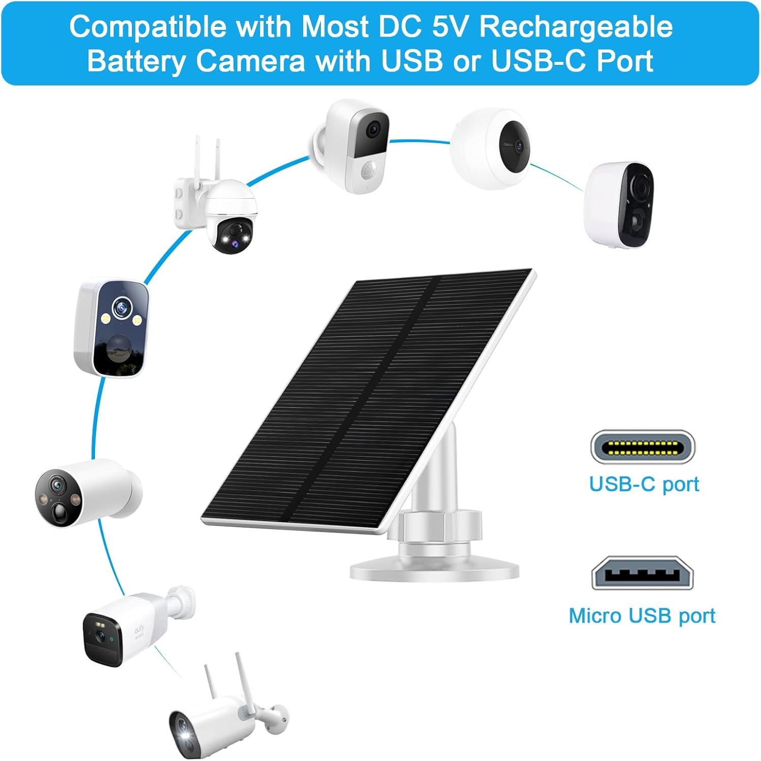 2W solar panel for outdoor camera, compatible with rechargeable battery cameras with micro USB or USB Type-C port.