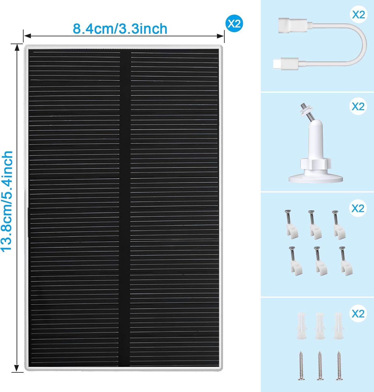 【Packing List】2 x 2W solar panels, 2 x 360° wall mounting bracket, 2 x screws bag, 2 x USB to Type-C port, 1 x manual, 2 x cable clips bag.