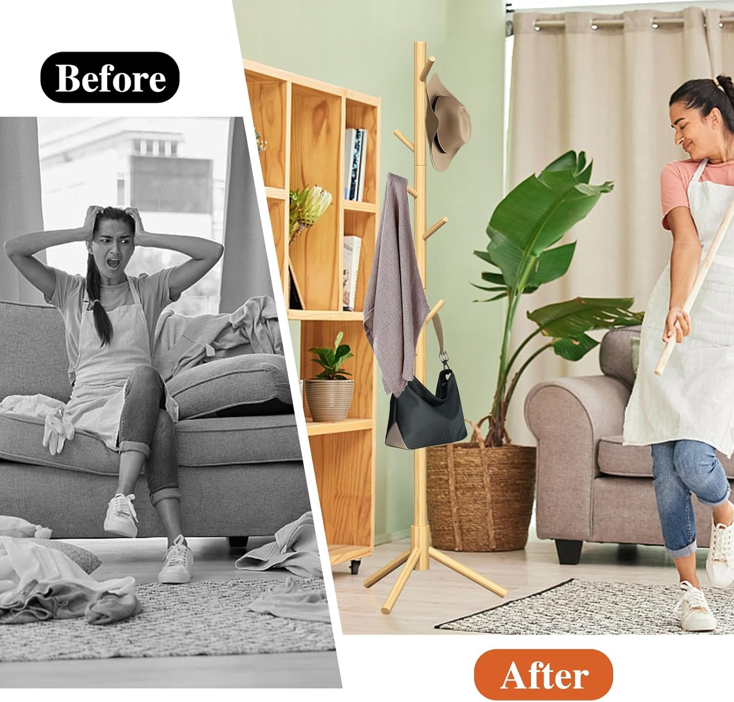【UNIQUE PROCESS】Our freestanding coat rack is made of high quality pine wood, carefully crafted by old craftsmen, the overall shape is simple and generous, keeping the original texture and color of pine wood, natural texture, practical and durable.