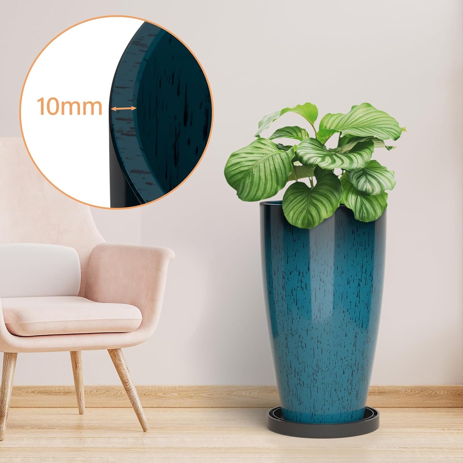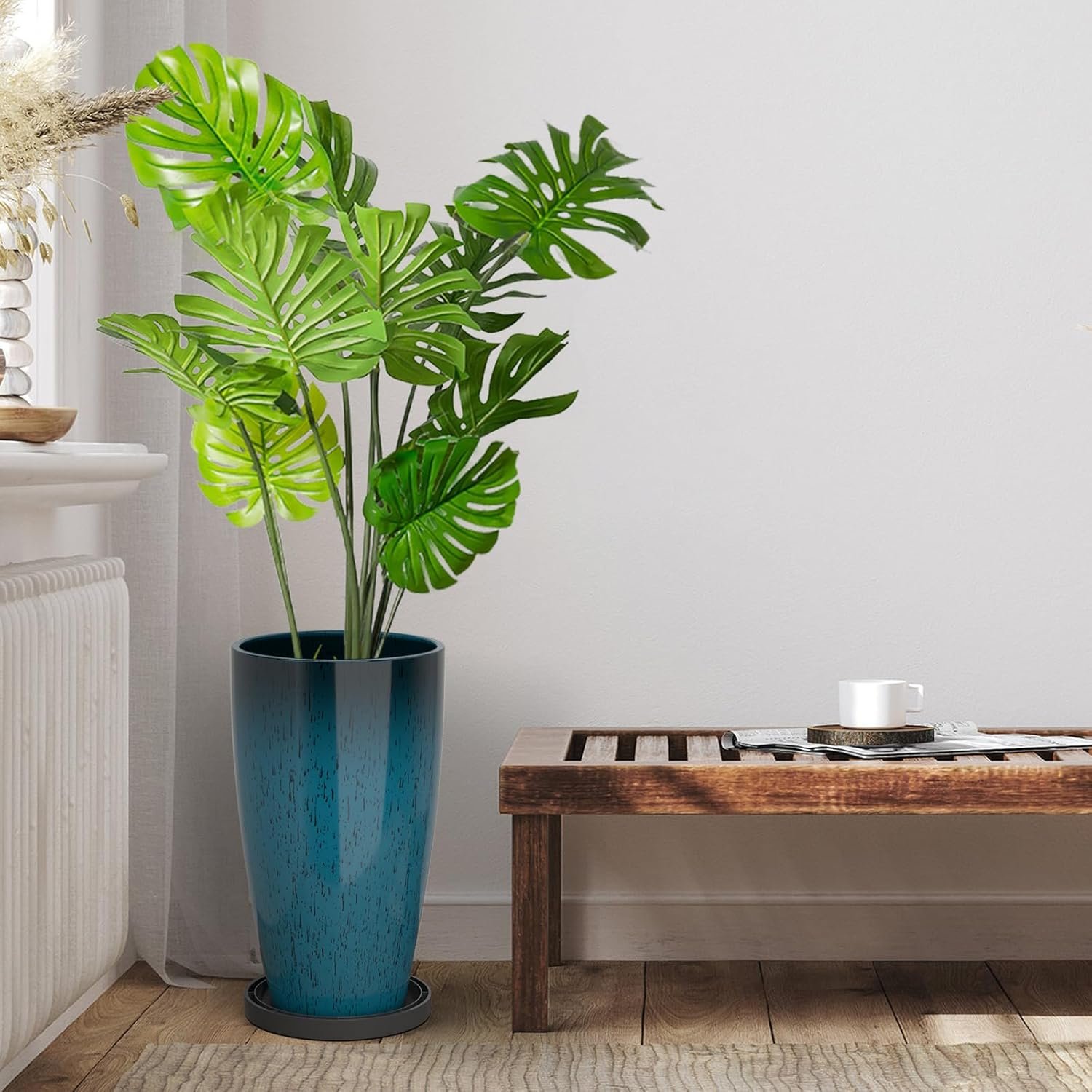 Customers find these planters beautiful, particularly appreciating their blue color, and one mentions they make their living room a showstopper. They are sturdy, with one customer noting they’re not made of thin plastic, and customers like their height and perfect size. Customers also find them good value for money and appreciate their weight.