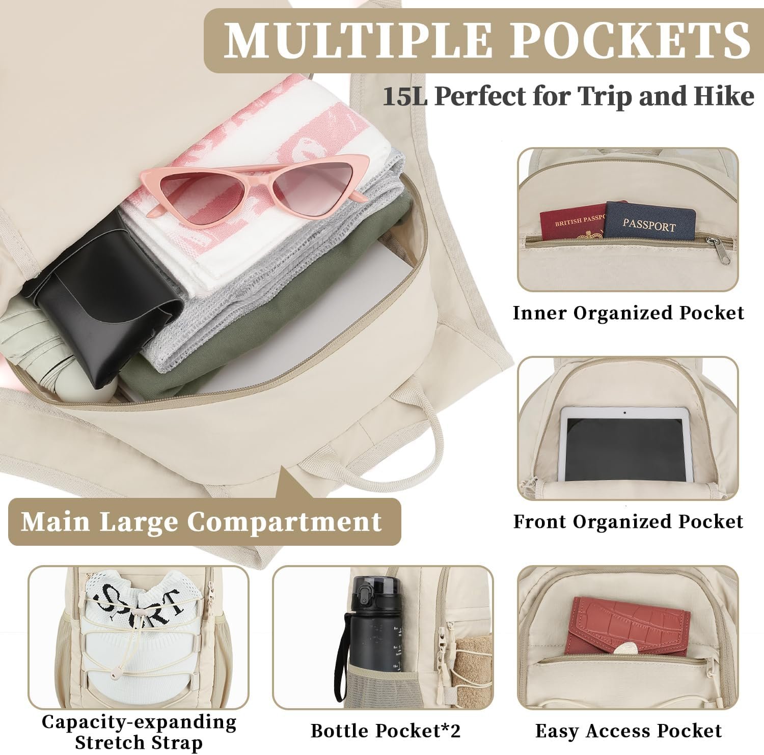 Compact Yet Spacious: This hiking backpack for women combines minimal size with maximum practicality. The 15l main compartment and zippered interior pocket can hold your travel and hiking essentials. Two quick-access front zippered pockets hold your phone, portable charger and more. Two side pockets can easily accommodate large water bottles and umbrellas. An elastic drawstring stores items such as hats or sports protective gear