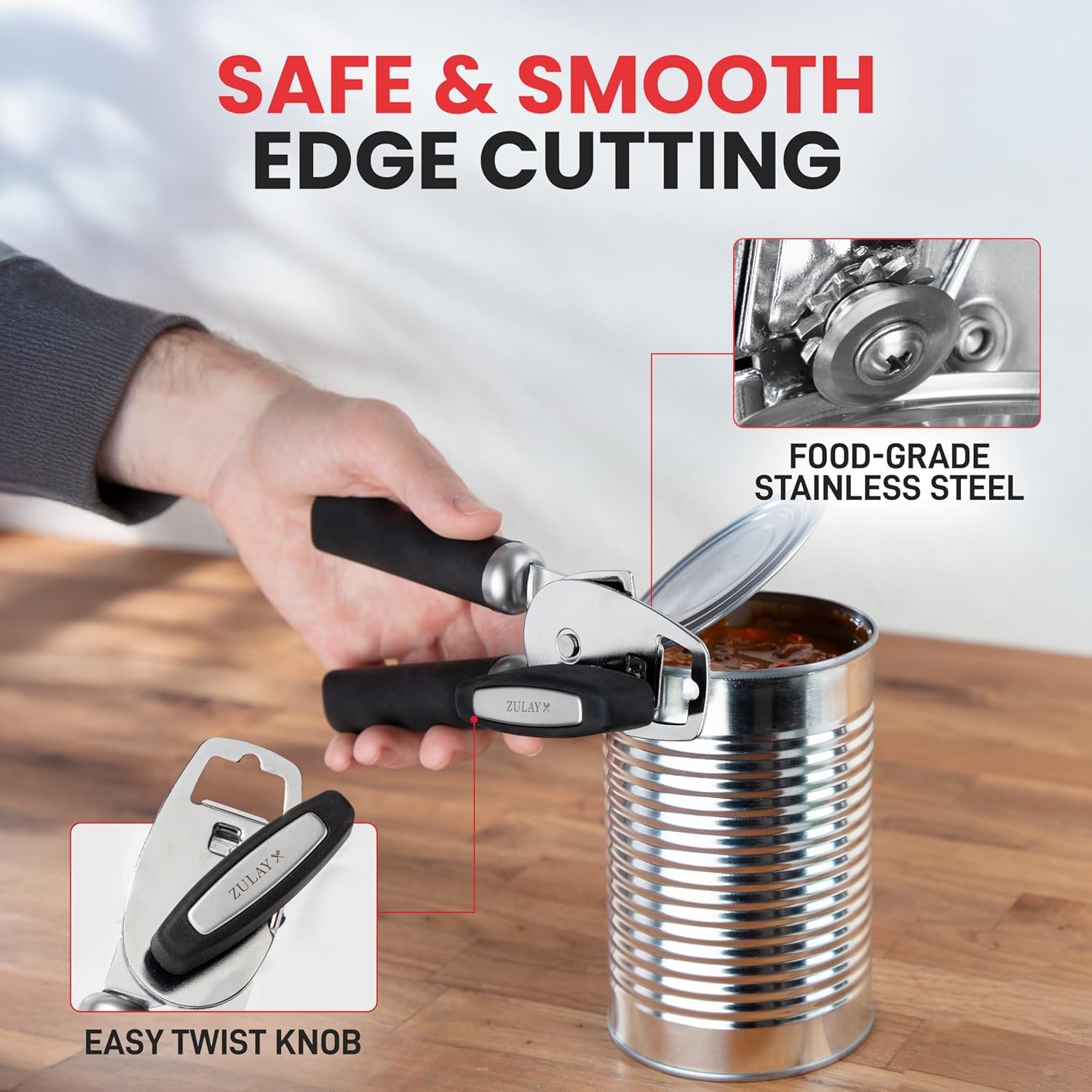 Zulay Kitchen Heavy Duty Stainless Steel Can Opener Manual with Bottle Opener – Rust Proof Manual Can Opener With Turn Knob & Soft Grip Handles – Black